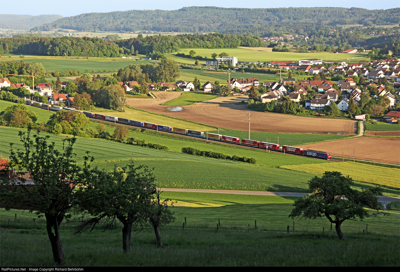 | Late in the evening, a locomotive Re 474 is en route with an intermodal train from Singen (Germany) to Gallerate (Italy). |