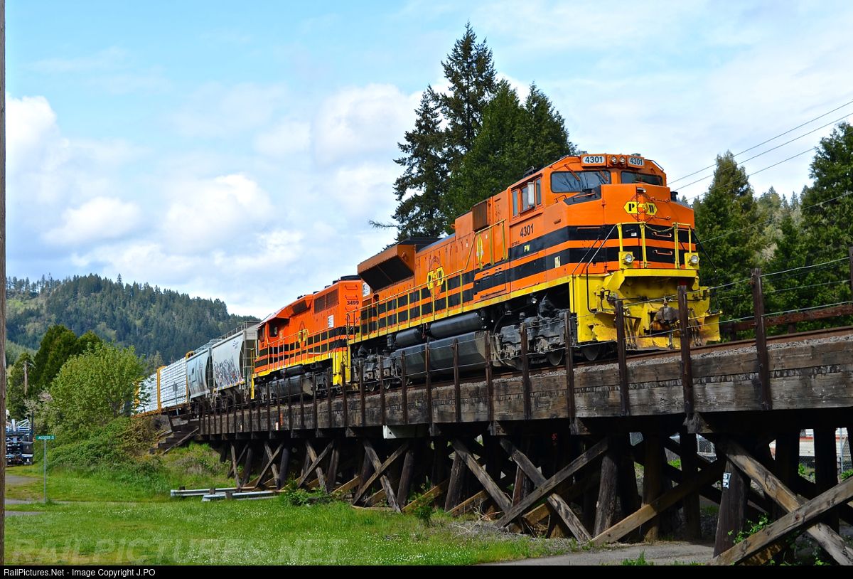 Under typical Oregon spring weather of rolling showers and sunshine, the daily Cottage Grove to Winchester Yard in Roseberg, OR hauler passes a wooden and steel truss bridge. The train is utilizing manned DPUs, including a former Providence & Worcester SD70M-2.