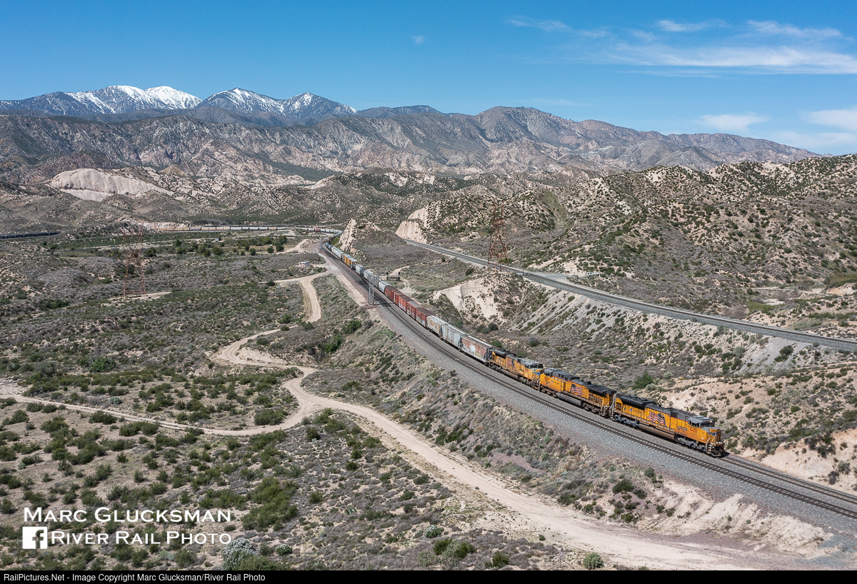 Snowy Peak. In a notable contrast of landscapes, the sparse desert of Phelan, California transitions to the snow capped summits of the San Gabriel Mountains as Union Pacific Railroad 8431 (SD70ACe) leads a manifest train towards Barstow on the morning of April 4, 2022. This area around Cajon Pass is an extremely busy route, with a constant flow of both Union Pacific and BNSF trains around the clock.