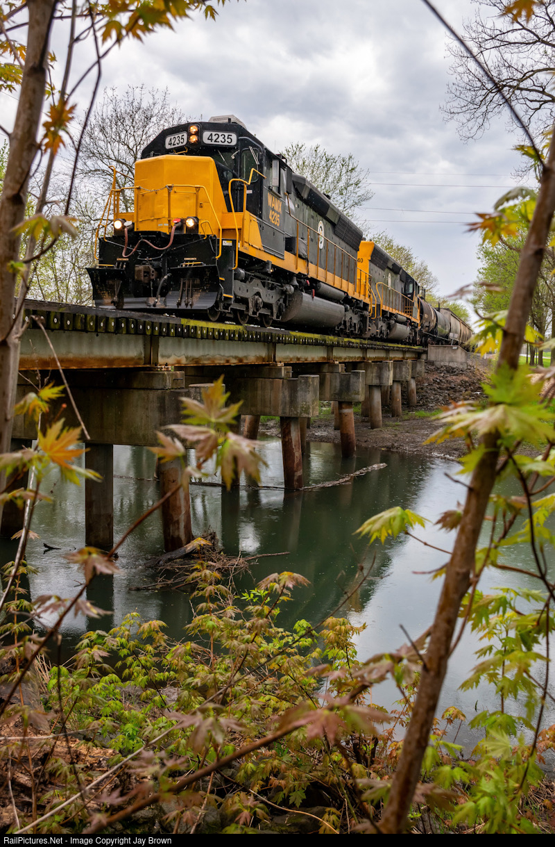 | With spring in full swing, the first leg of DREIs wayfreight from Decatur to Terra Haute is seen here traversing the Embarras River in Camargo, with two SD40-3s sporting SD45 carbodies. |