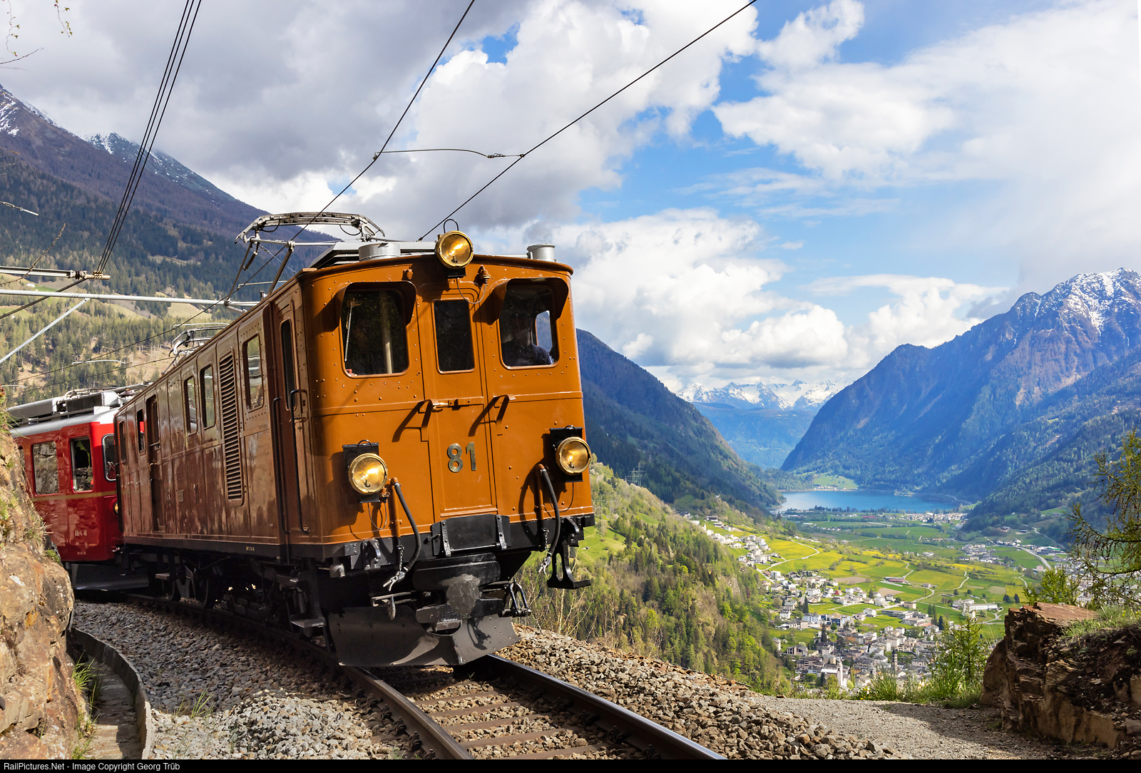 | Former Bernina Railway locomotive Ge 4/4 # 81 of the Blonay-Chamby Railroad Museum, as guest on the old home rails, is due to enter the Varuna II tunnel on the south ramp of the Bernina line with a R.M. photo charter train. The view goes to Poschiavo, Lake Poschiavo and the Bergamasque Alps in Itlay. |