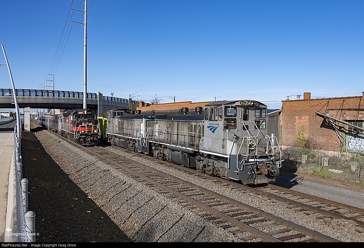 On the afternoon of April 30th, 2022, Amtrak Work Extra 535, powered by two EMD MP15DCs, idles on the Parkville Industrial as CTrail train 6459, led by a EMD GP40-3H, zips by on the MRS Main Line in West Hartford, CT.