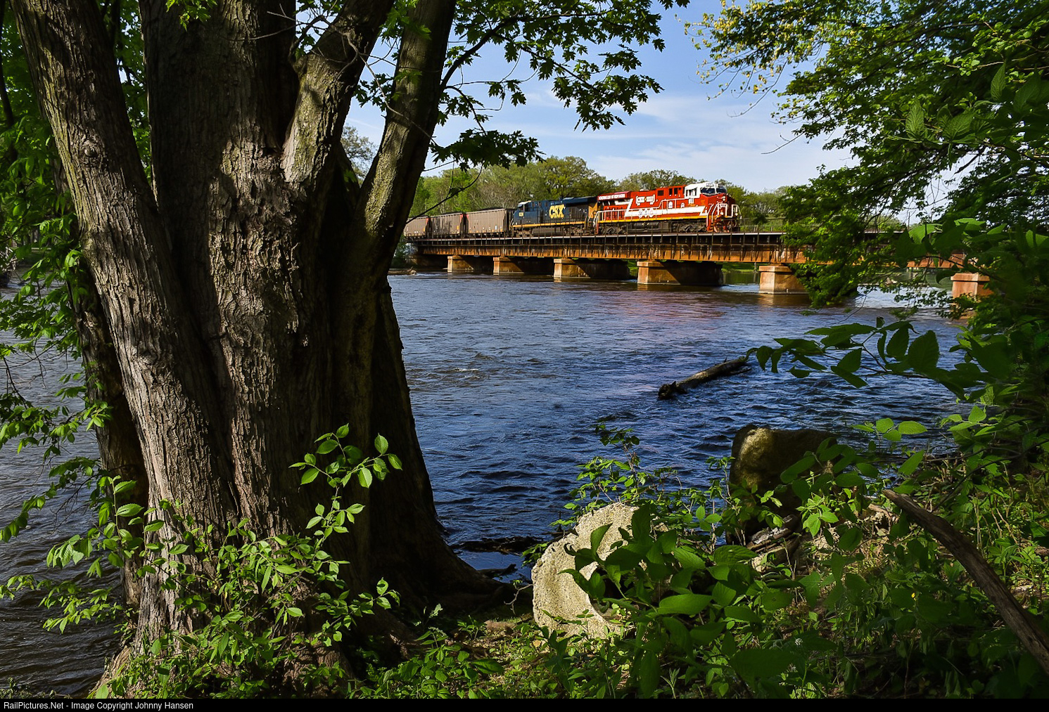 | B419 crosses the Kankakee River at Momence with CSXT 911 leading, the “Spirit of Our First Responders” locomotive. The afternoon spring sunshine made this amazing locomotive stand out! |