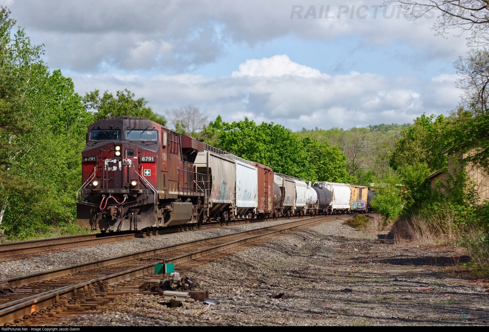 | CP 8791 powers train Q560 along the last few miles to its final destination of Selkirk, New York. This locomotive has certainly been busy as evident signs of years of crime give it an almost black appearance. |