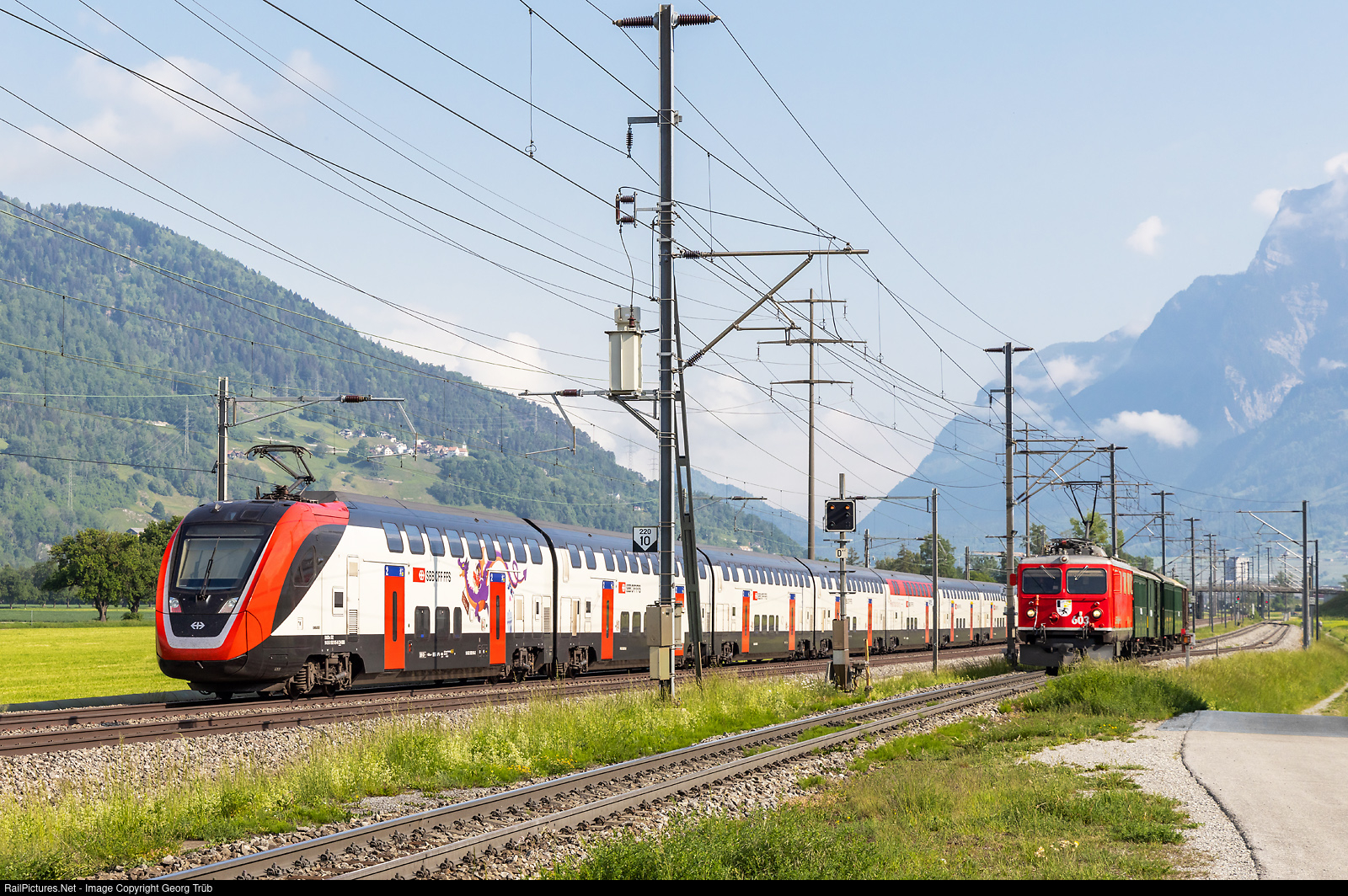 Random meeting of trains of the SBB (standard gauge) and Rhaetian Railway (1 meter gauge) in Zizers. The "FVD" doubledeck intercity train RABDe 502 # 015 of the SBB is running as IC 564 of the line IC3 from Chur to Zürich, while Ge 4/4 I # 603 of the RhB is pulling the empty rolling stock train 9525 from Landquart to Chur in the opposite direction.