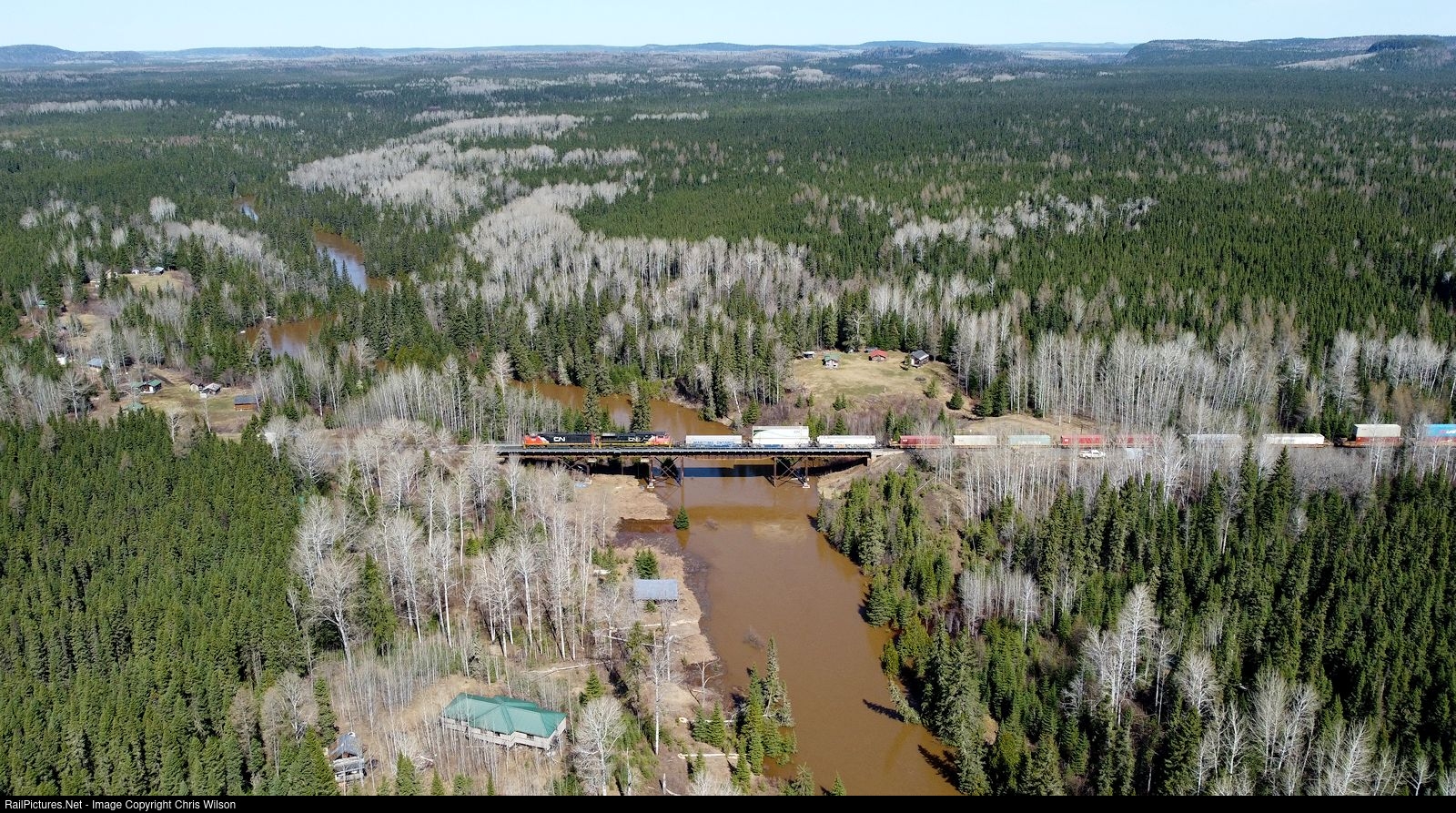CN Q107 soars across Pikitigushi River swollen with spring runoff.