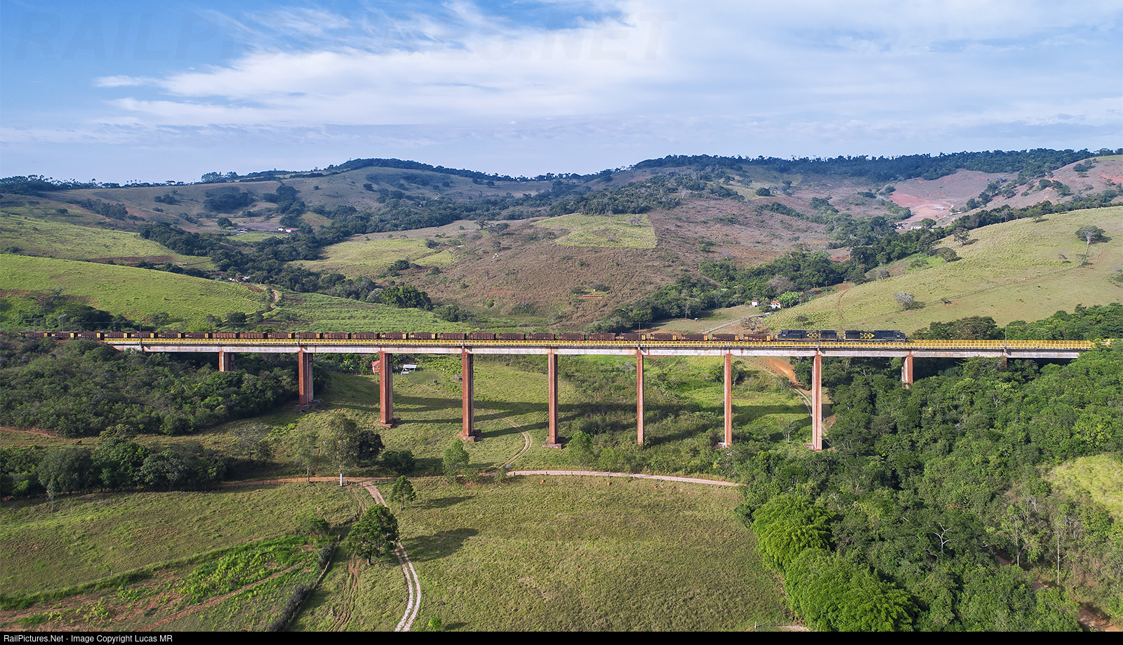 | Southbound loaded ore train NFG0124 led by AC44i #3487 photographed crossing viaduct #66, between P1-13 (São João del Rei) and P1-12 (Cel. Xavier Chaves) yards. |
