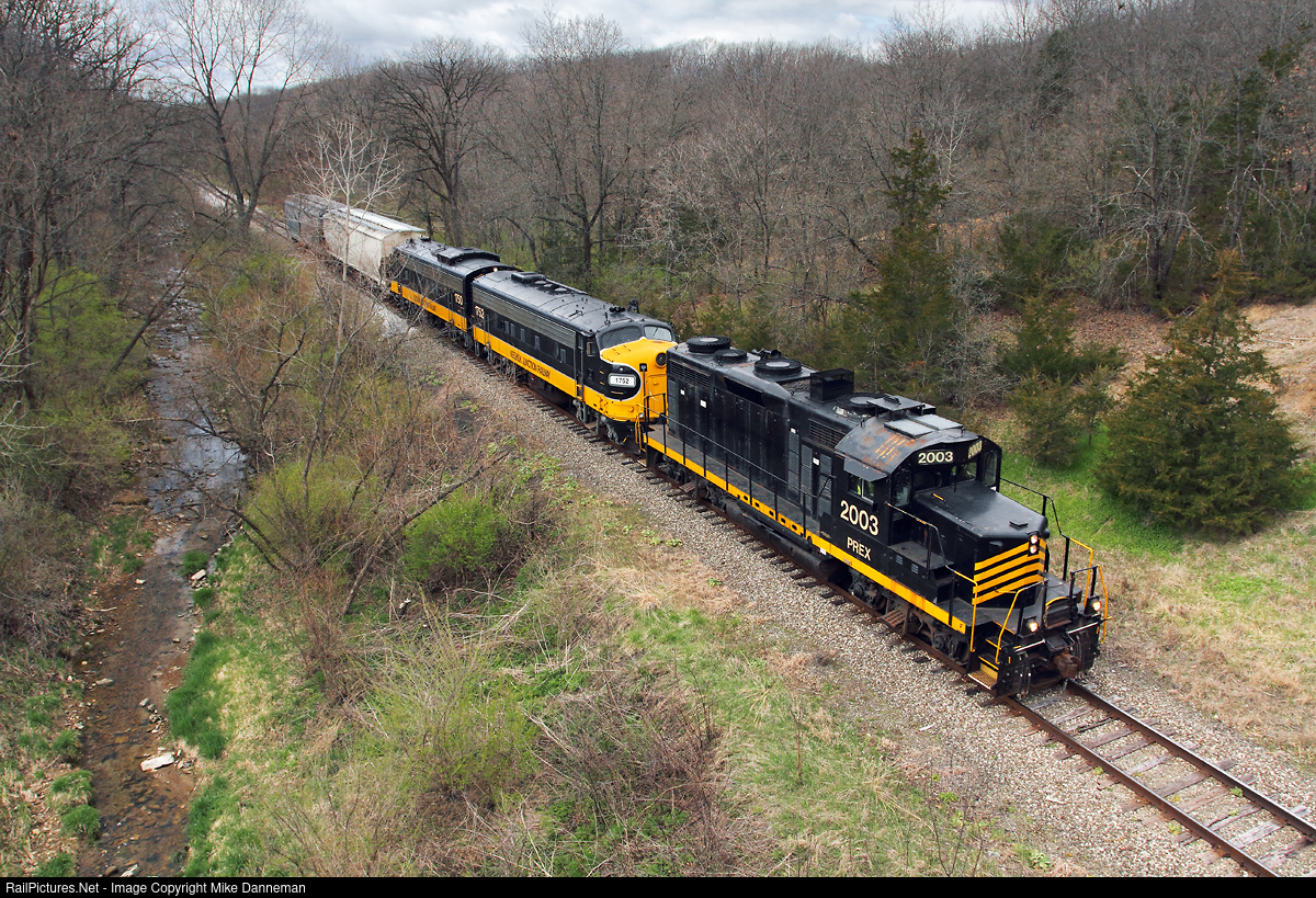 A short Keokuk Junction Railway freight is about to pass under the Marietta Road overpass at Marietta, Illinois, on April 7, 2016. KJRY (PREX) GP20 No. 2003, along with FP9s Nos. 1752 and 1750, haul two cars picked up at Bushnell eastbound to Kolbe.