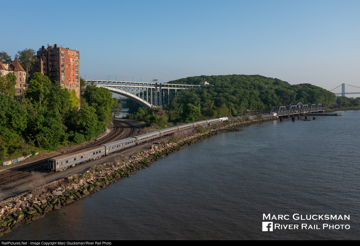 A Pair Of PVs. On Thursday, May 19, 2022, former New York Central lounge/diner/sleeper "Swift Stream" (RPCX 800460) and Webb Rail's former New York Central Railroad Budd built Pullman obs/diner/sleeper "Babbling Brook" (WEBX 800007) held the markers on Amtrak Train 244 is it approached the Spuyten Duyvil Bridge, which connects the Empire Corridor from the Bronx to New York, New York. The Henry Hudson Bridge is seen on the left and the George Washington Bridge in the far distance on the right.