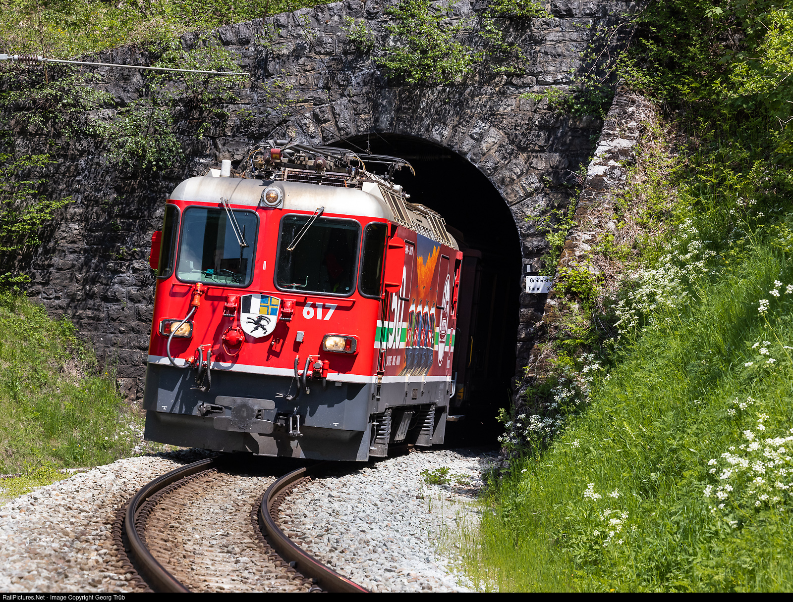 Ge 4/4 II # 617 of the Rhaetian Railway, in the publicity paint scheme for 50 years LGB (Lehmann Gross Bahn, part of Märklin today), is pulling the freight train 5135 from Landquart over the Albula line to Pontresina, leaving the Greifenstein spiral tunnel above Filisur.