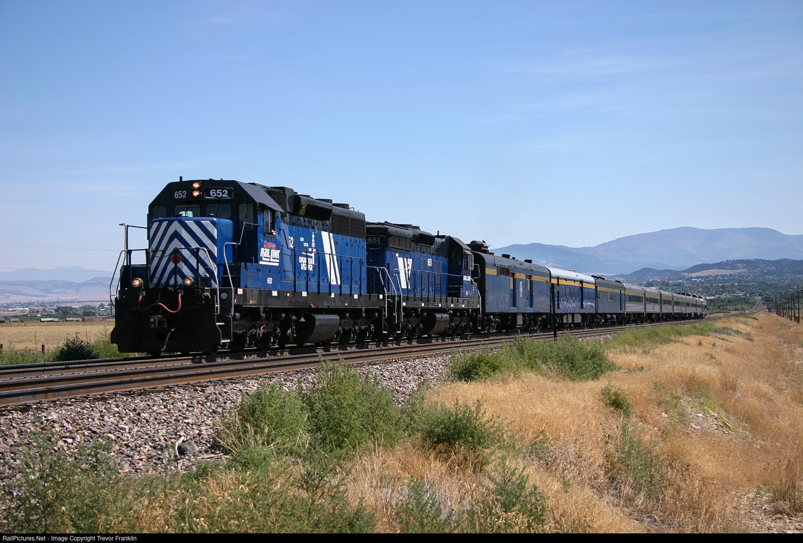 The Montana Rockies Daylight climbs out of Helena headed for Mullan Pass on a hot and dry August afternoon. This train was a two day trip operated by Montana Rockies Rail Tours and the MRL for a time, leaving Livingston around 9:00, overnighting in Missoula, and carrying on to Sandpoint before returning east the next day. Being somewhat akin to today's Rocky Mountaineer, it would unfortunately be discontinued not long after this photo was taken in 2004. Today it's led by its standard power, veterans 652 (SD19-1 built for the SP in 1956) and 651 (SD-9 built for the EJE in 1957) which would soon be out of service as well, neither making it past 2008. The rest of the train was comprised of a power car, crew car, dorm car, four coaches, three dome cars, a lounge car and a diner.