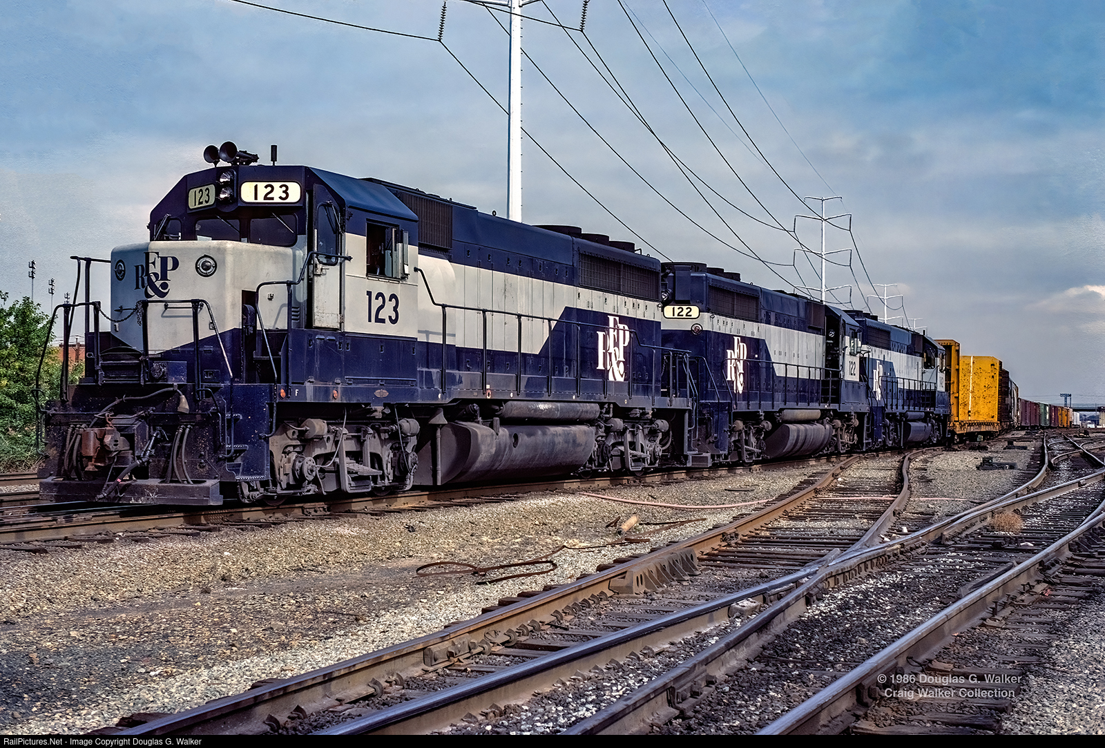 Richmond Fredericksburg and Potomac train Extra 123 South crawls out of the railroad’s "Pot Yard" (the nickname for their Potomac Yard) behind a pair of GP40s (123 and 122) and a GP40-2 (142). The RF&P operated from 1836 until 1991, when it became part of CSX Transportation. (Alexandria, Virginia – September 12, 1986) Douglas G. Walker Photograph, Craig Walker Collection