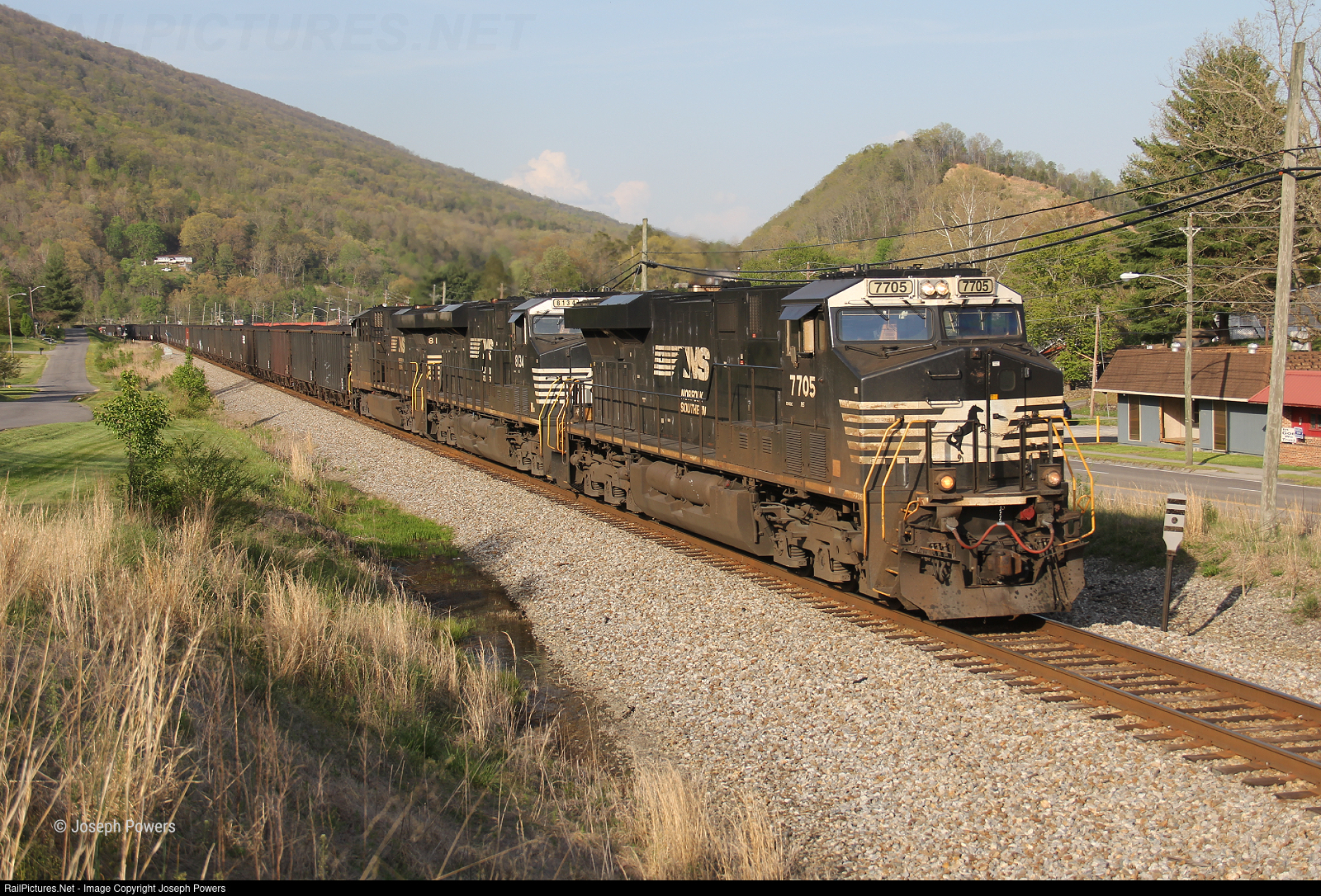 Rolling east through Weber City, Virginia, Norfolk Southern coal train U42 is a few miles away from its destination at Frisco, Tennessee. The train originated at Andover, Virginia. A Southern Railway era whistle board is to the right of the lead locomotive.