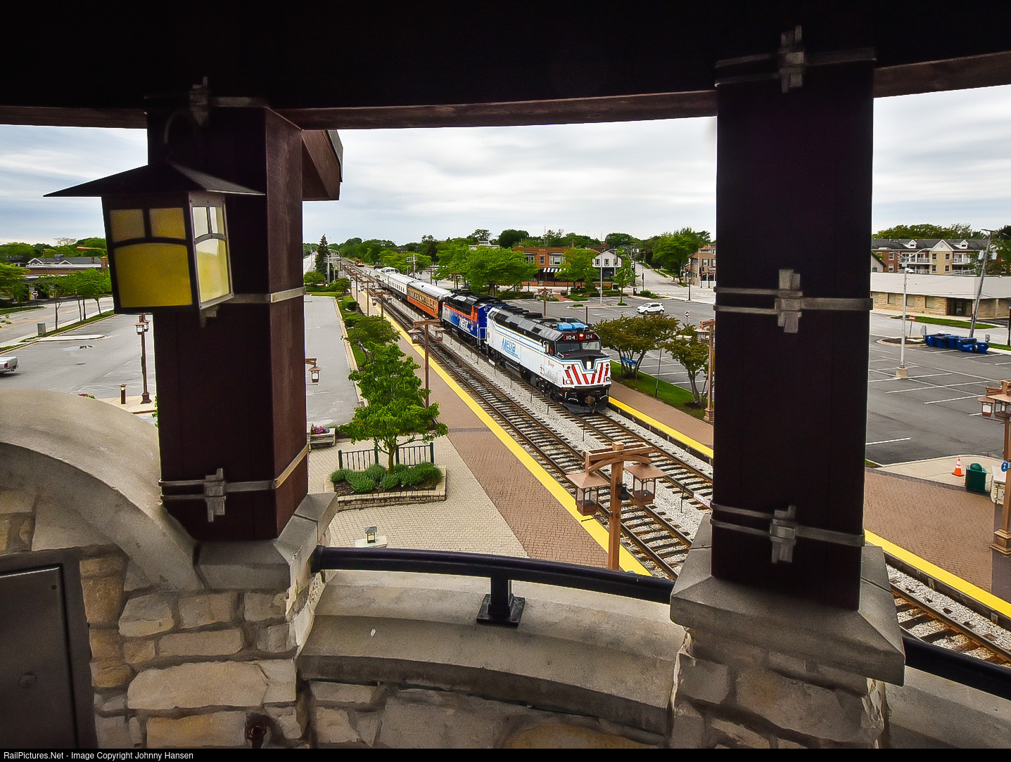 | Viewed from the Oak Park Avenue Metra Station clock tower, Metra’s brand new freshly painted “Honoring Chicago” F40PH and a F59PH lead three private cars east through Tinley Park at trackspeed for a private event at Lasalle Street station in Downtown Chicago. |