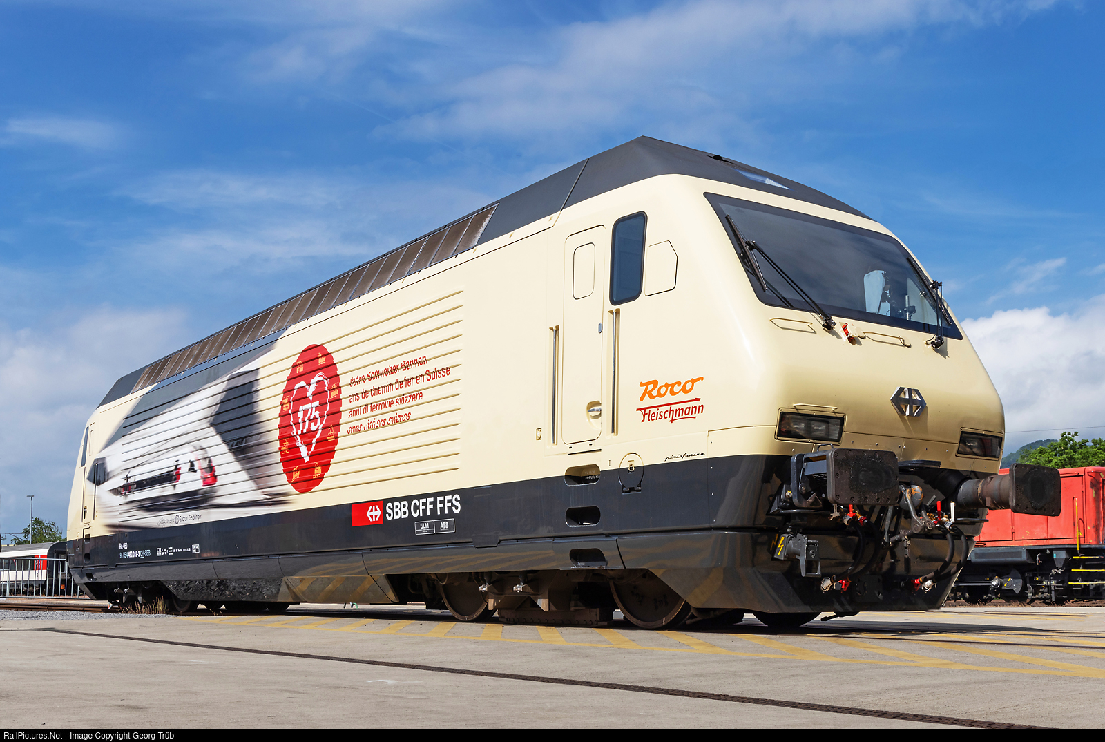 On the weekend of May 21-22, 2022, the first anniversary event to celebrate 175 years of railroads in Switzerland took place, with events mainly in Olten and Basel. The anniversary locomotive Re 460 # 019, designed by the Austrian designer Gudrun Geiblinger, was on display at the SBB industrial plant in Olten. This locomotive shows the official first train leaving the newly opened Gotthard Base Tunnel at the north portal near Erstfeld on 1 June 2016. The photo template was mirrored so that the train comes from the left (in reality it was the other way around).