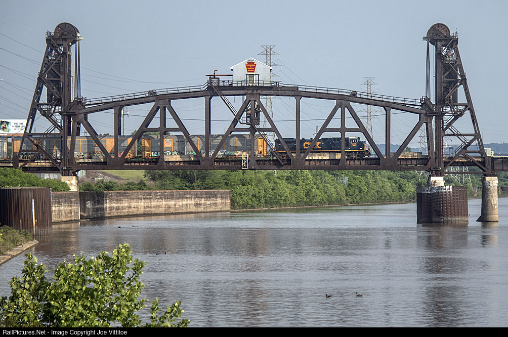 CSX 7026 former 166 leads Q216 as it crosses the lift bridge at Clagg. Q216 will travel north over the LIRC to Seymour where it will then head east for Cincinnati.
