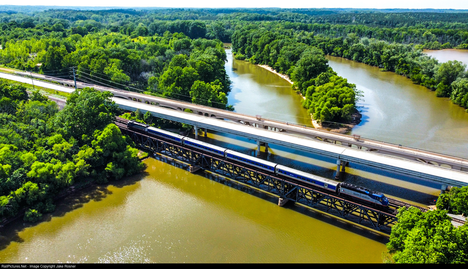 Amtrak 76 hustles across the Yadkin River trestle, timed to where the entire train is shown on the trestle.