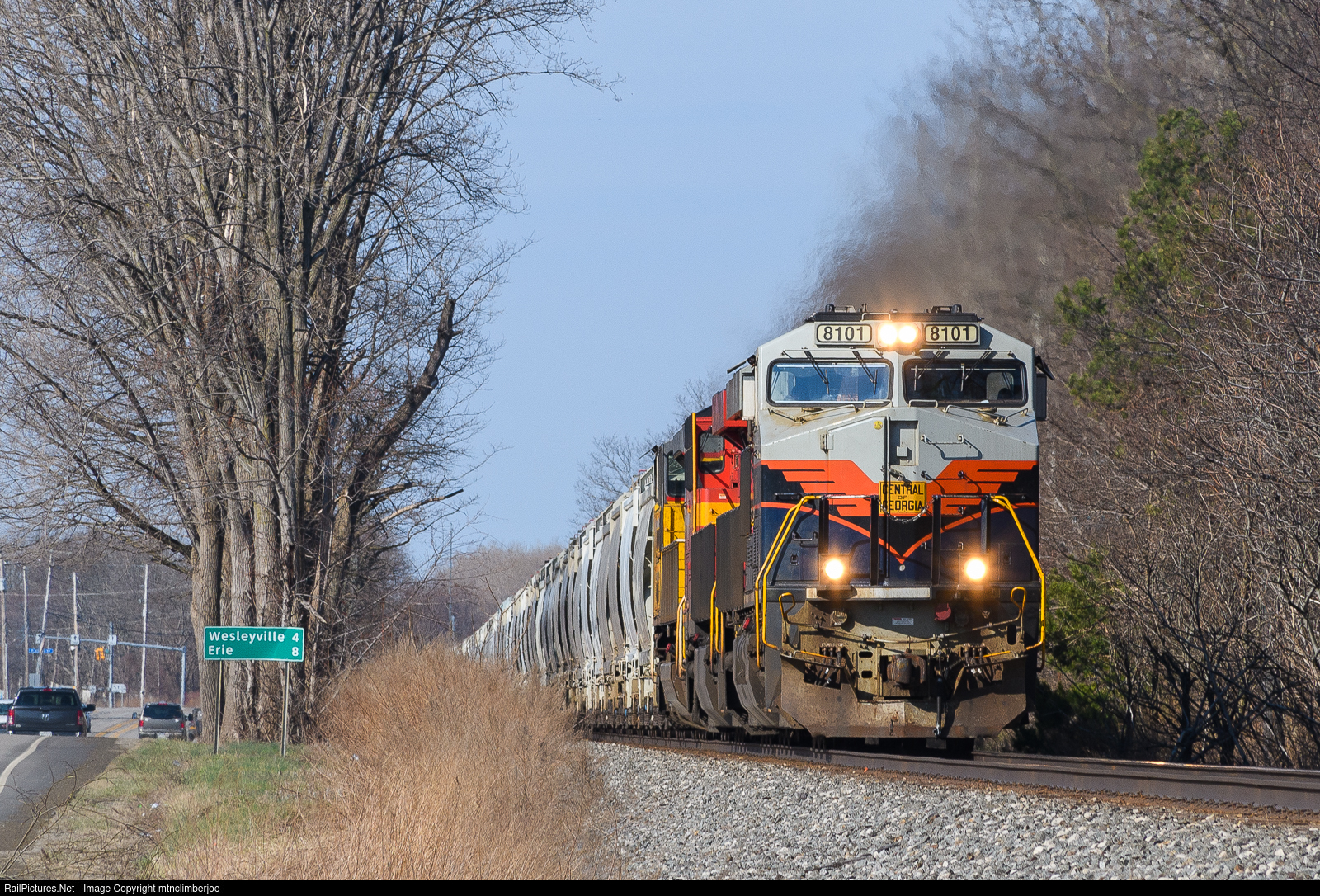 | Norfolk Southern unit sand train 68N rolls east of Erie through Harborcreek, Pennsylvania behind a colorful lashup. In the lead are the Central of Georgia and Norfolk Southern heritage units, followed by a Union Pacific SD70ACe. |