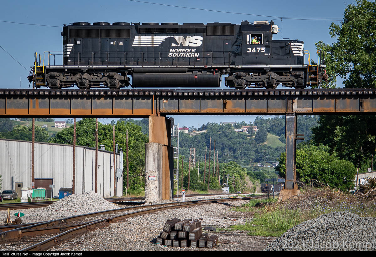 | NS 3475 is the lone unit on local 93J exiting the yard at Kenova, WV waiting to head eastbound to pickup a train outside of town. CSX's former C&O Kanawha Sub runs below the bridge. |