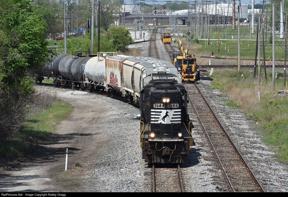 | NS GP60 7144 enters the Kankakee Line at Osborn with B12, bound for Kankakee. The IHB Gibson Roundhouse stands in the background. |