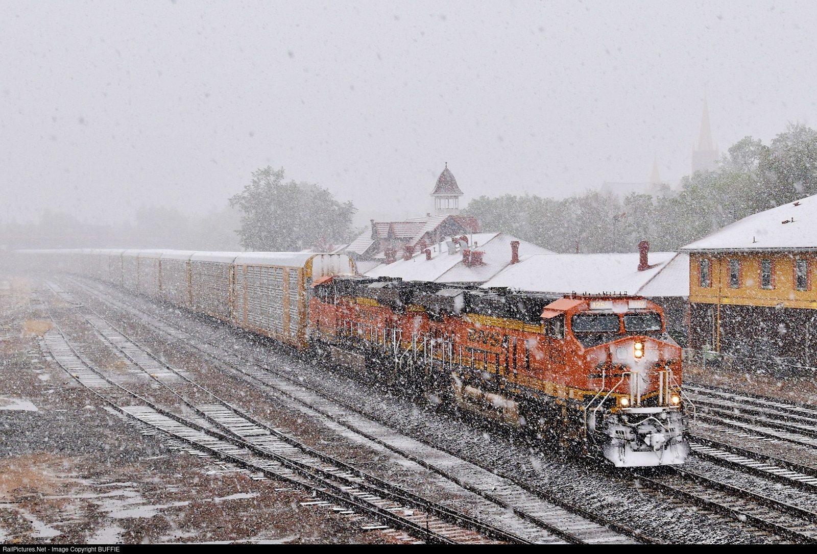 BNSF 4252 leads an auto rack train in the snow past the former Colorado Springs Depot in downtown Colorado Springs.