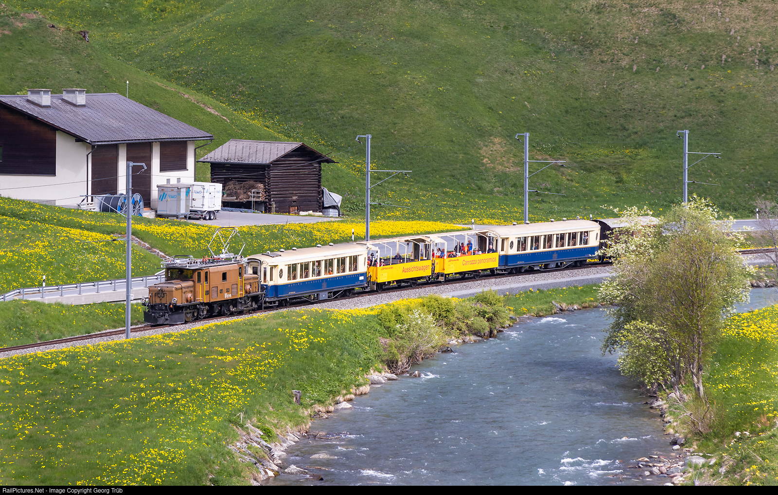 "C-C" or "Rhaetian Crocodile" Ge 6/6 I # 414 of the Rhaetian Railway, built in 1929, is pulling train 7815 "Nostalgiezug Zügenschlucht" (nostalgia train through the Zügen gorge) from Davos Platz to Filisur, through the yellow dandellion meadows between Davos Frauenkirch and Davos Glaris, along the Landwasser river. This train is running twice a day in summertime, replacing a timetabled regular train. In the train are today parlor car As # 1143, open observation cars B # 2096 and B # 2106, parlor car As # 1142 and covered freight car D2 # 4079 (for bycicles, prawns etc.).