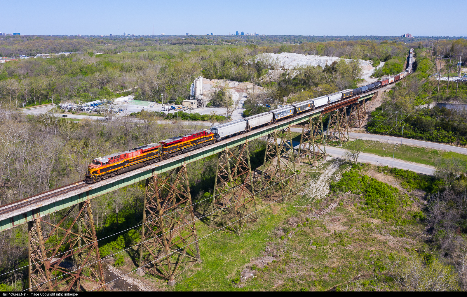 A pair Kansas City Southern GEVO's lead a southbound grain train as they climb the grade out of Kansas City, Missouri and soar across the valley on the 875 foot long 63rd Street Trestle.