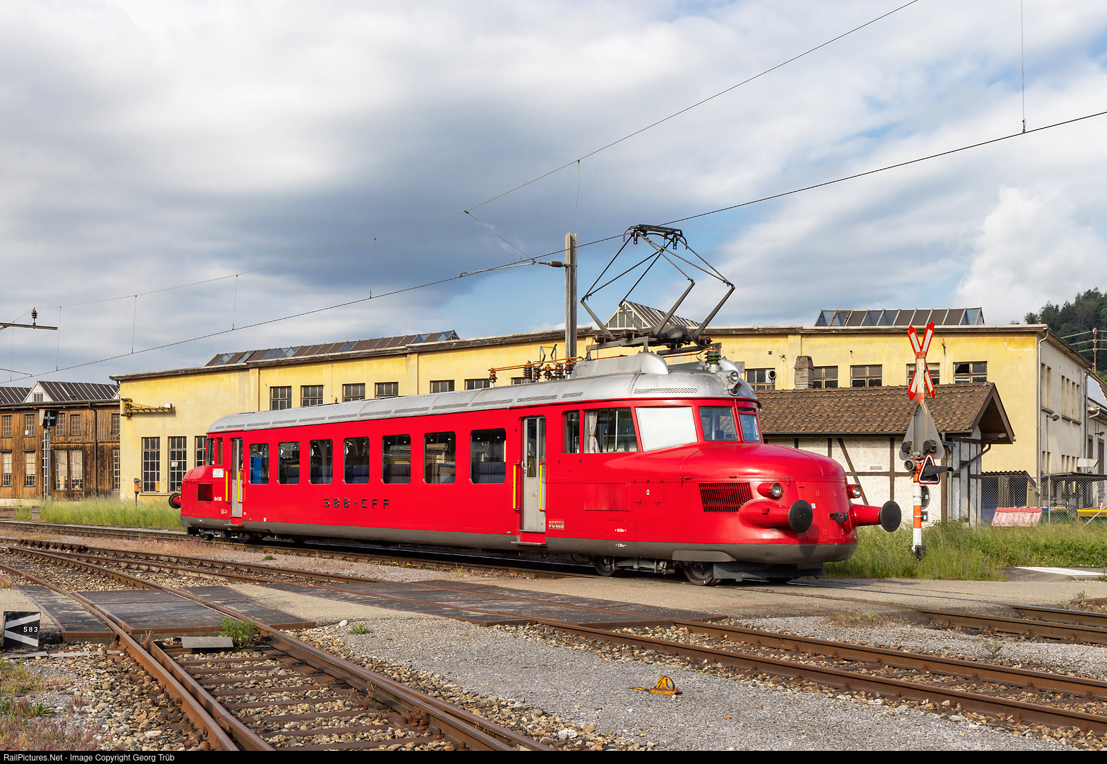 The iconic railcar "Red Arrow" RAe 2/4 # 1001 of SBB Historic, built in 1935, is running light from the shed area to Olten station, to get guests of the 175 railways in Switzerland celebration event. The vehicle was built as CLe 2/4 # 201 with 125 km/h maximum velocity and is historic vehicle since 1968, based in Olten since 2004.