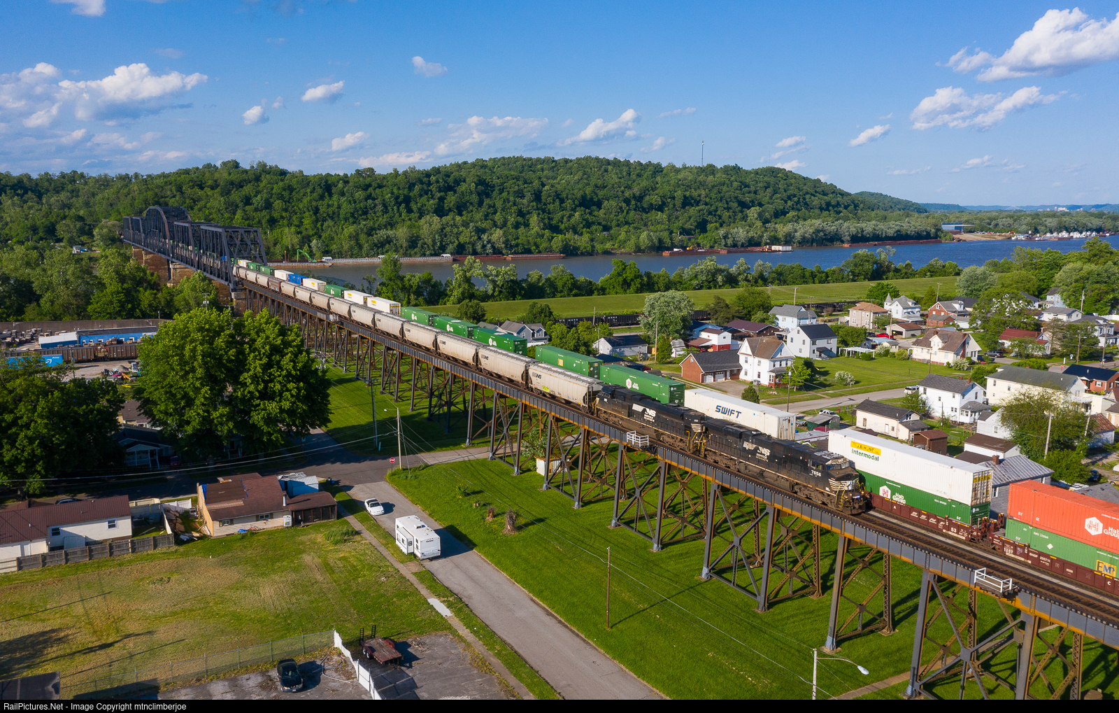 | An eastbound Norfolk Southern grain train rolls across the massive Ohio River Bridge as it comes into Kenova, West Virginia from South Point, Ohio. The double track bridge is built with 4 Baltimore Through Trusses and 1 central Pennsylvania Through Truss, with a long approach trestle on the south side for a total length of 4000 feet. |