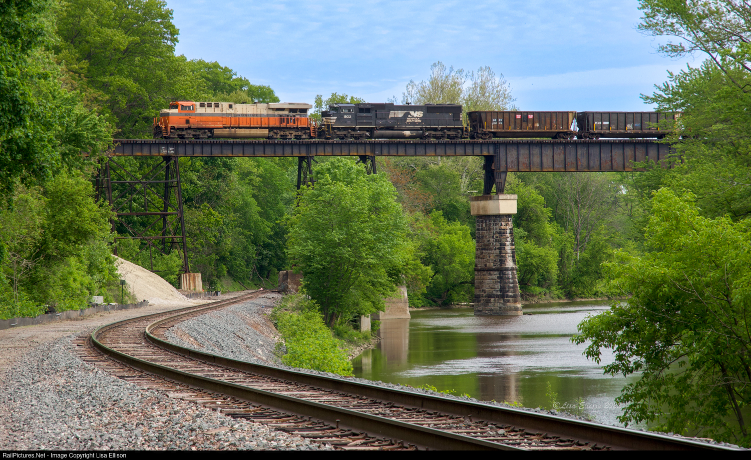 The NS 15M, with the Interstate Heritage unit leading, heads west across the Conneaut Creek Trestle in Conneaut, Ohio. This bridge is slated for replacement sometime in the next year.