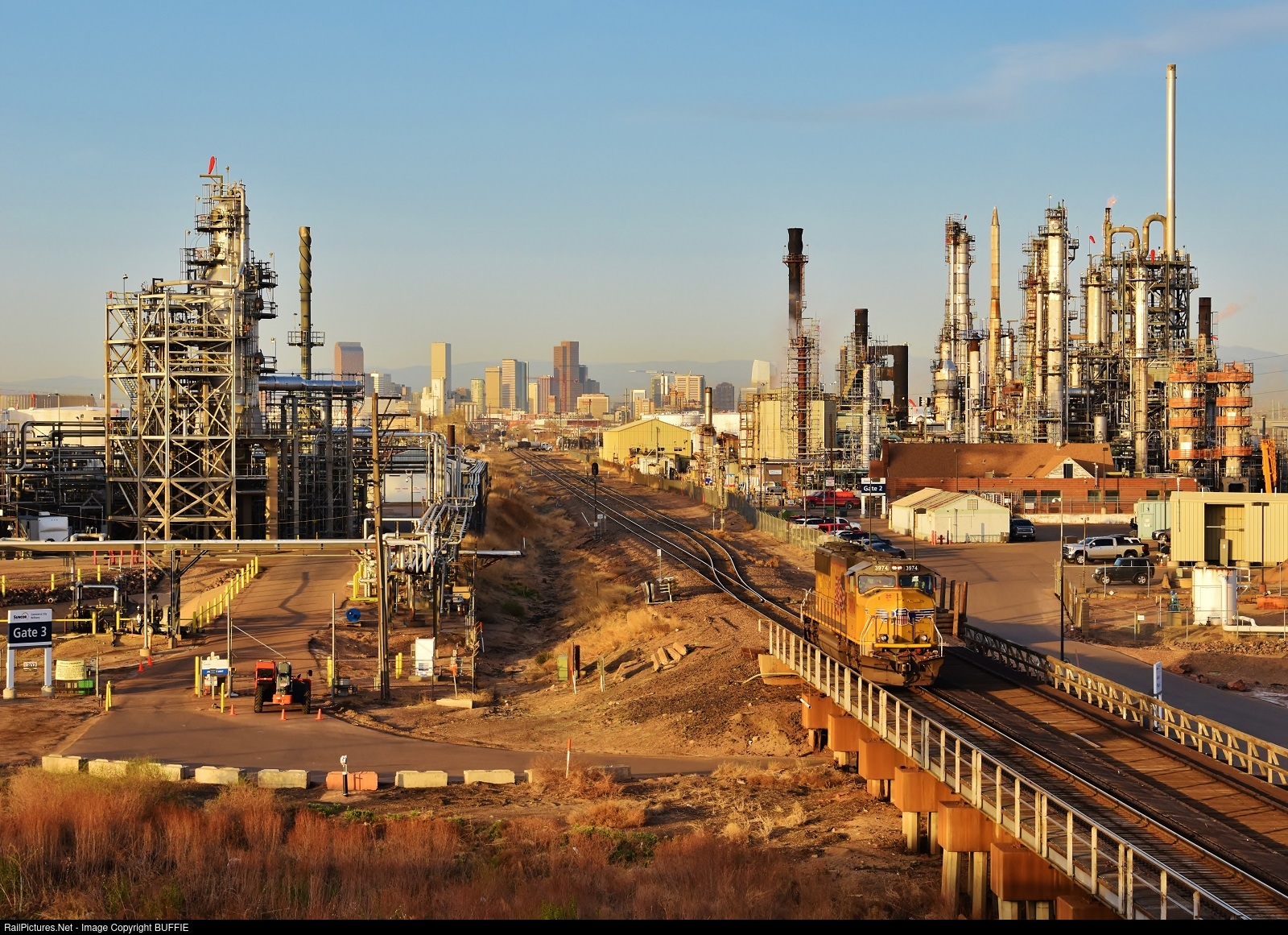 UP 3974 (SD70M) runs solo back to Denver, passing between the Commerce City refineries on the Greeley Sub.