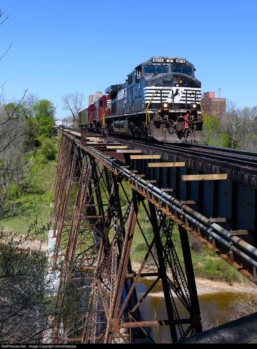 | Norfolk Southern's geometry research train heads east through Ashtabula, Ohio after coming on duty in Carson Yard on the Youngstown Line. The train is crossing the trestle over the Ashtabula River as it now heads east on the Lake Erie District towards Buffalo. |
