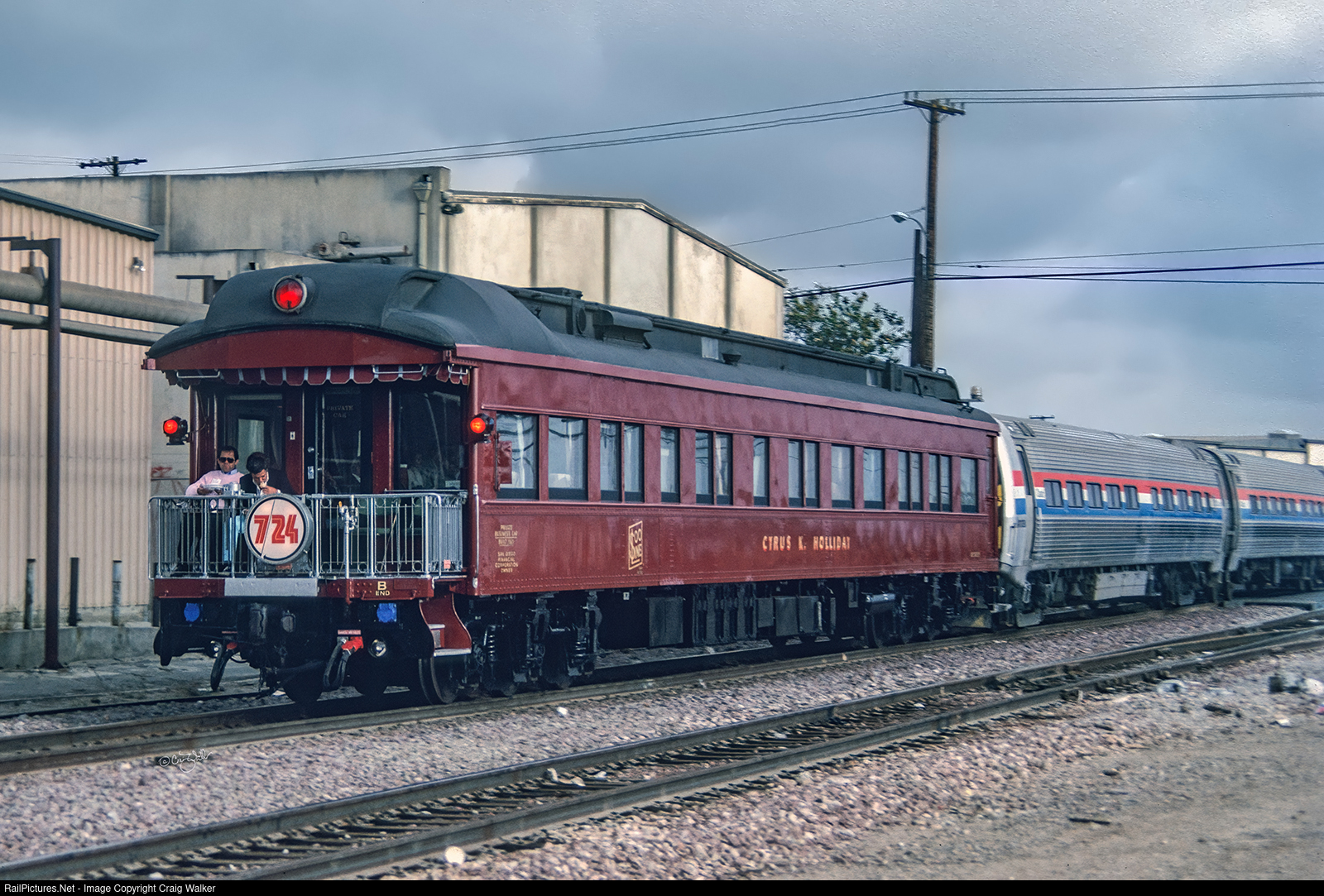 A former Soo Line business car, built in 1921, brings up the markers (in this case, old school marker lights) as Amtrak San Diegan 578 rushes through the city of Orange on its way from Los Angeles to San Diego. This car’s origins are a bit murky, but it is owned by the San Diego Financial Corporation (owner of San Diego Trust and Savings Company, and then owned by Kennebec Financial Corporation of San Diego when SDFC was merged with First Interstate Bank of California) and, while it is painted in Soo markings, it carries the name of the Santa Fe Railway’s first president, Cyrus K. Holliday. This car, still painted this way, is still in service occasionally today. (Orange, California – May 1989)