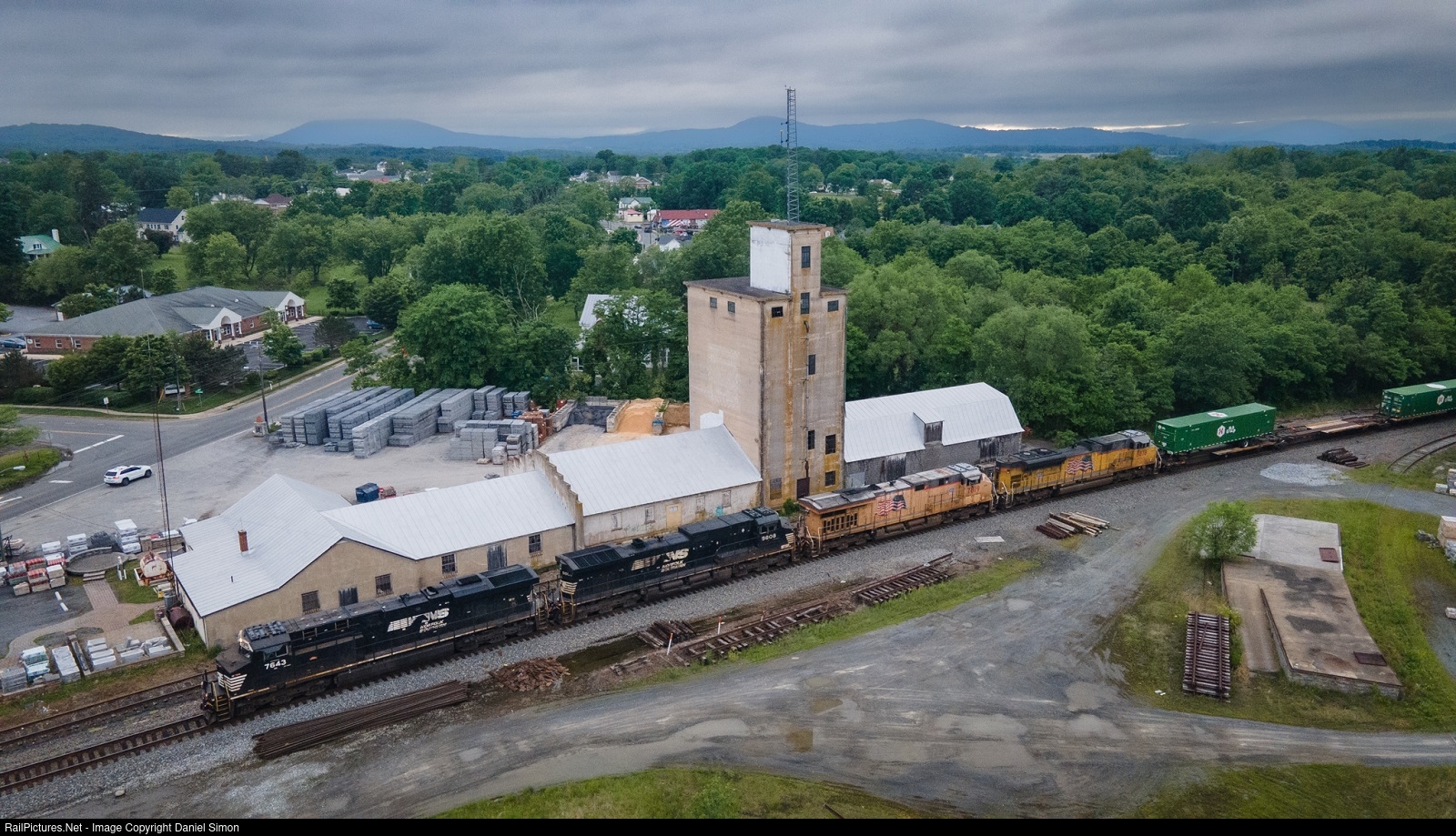 On a dull afternoon, two Union Pacific visitors give color to the Norfolk Southern B-Line as NS train 203 (Rutherford, PA-Atlanta, GA intermodal) heads east past the old Purina tower in Marshall, Virginia.
