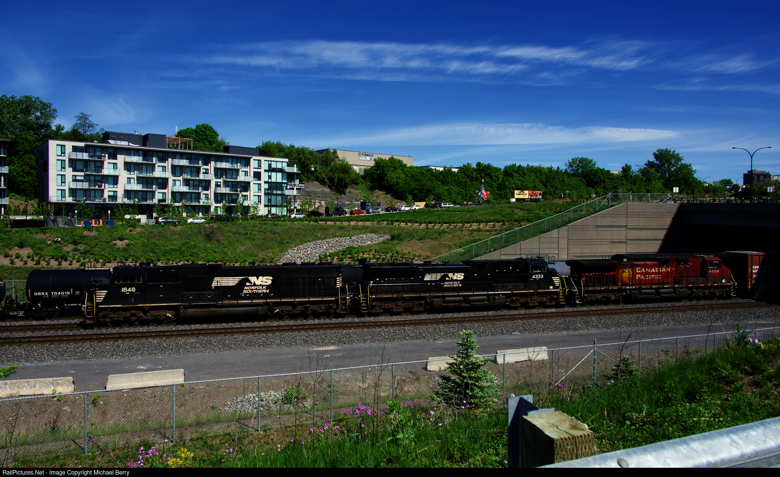 | CN 529 has a pair of rebuilds and a CP unit (NS 1848, NS 4333 & CP 9829) as it passes CN 310, which is finishing setting off cars on the Transfer Track. NS 1848 was rebuilt from SD70 NS 2520 in 2019 and NS 4333 was rebuilt from Dash 9-44CW NS 9010 in 2020. |