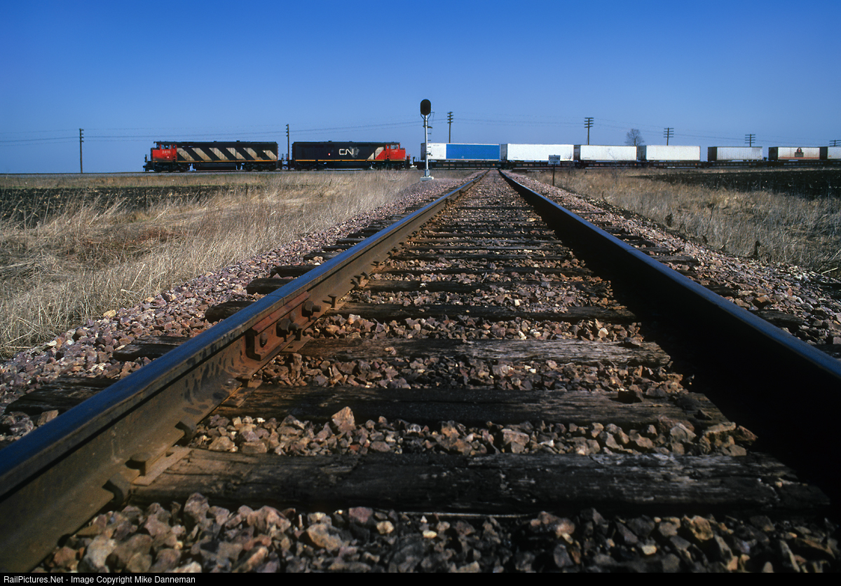 A Canadian National freight crosses the Chicago & North Western’s branch line to Troy Grove between Waterman and Shabbona, Illinois, on April 2, 1995. Powering the westbound train is a pair of unique GE C40-8M cowl locomotives in two different CN paint schemes.