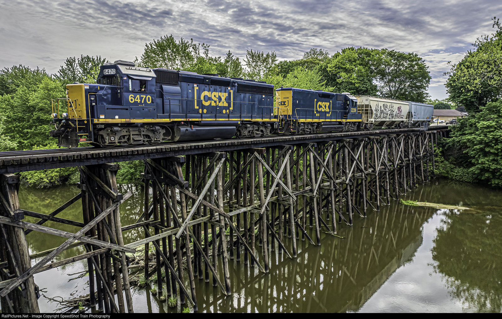 | On May 24th 2022 CSX made their last run down the 6 mile stretch of the Hamilton Michigan Branch. They will be transferring this line over to the Hamilton Northwestern RR Co. very soon. Here we see the CSX 6470 leading a slug set with 2 cars back NW towards Holland across the wooden trestle in downtown Hamilton Michigan |