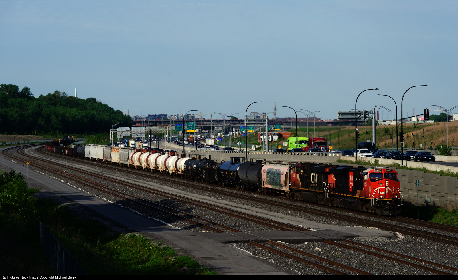 CN 100 unit CN 3887 & CN 2253 lead a short CN 321 towards Turcot Ouest. With only 55 cars, they will be lifting cars at Coteau and Brockville. In just a a mile or two they will be stopped by a PTC penalty, an odd thing to happen in Canada, where PTC is not used.