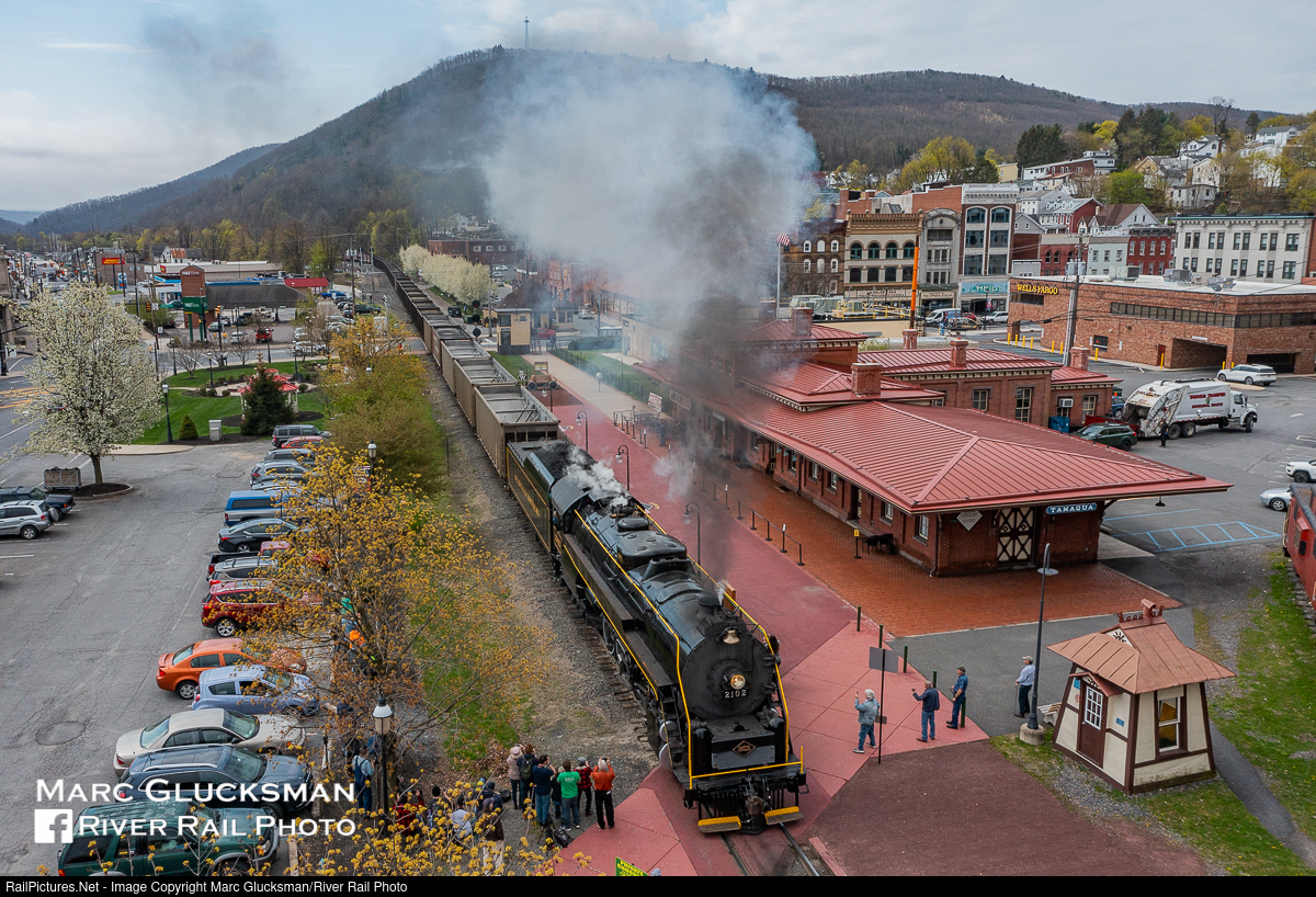 Passed The Test. Reading and Northern Railroad - Passenger RBMN T-1 2102 (4-8-4) passed by the former Reading Railroad Station in Tamaqua, PA on Tuesday, April 26, 2022 under its own power for the first time since 1991. During the the first of two load tests, it brought 50 coal hoppers from North Reading, Pa to Jim Thorpe, PA and back to Tamaqua. On Saturday, May 28, 2022, the RBMN will kick off its ambitious steam passenger schedule for the season using this engine. The Tamaqua Station, built in 1874 by the Philadelphia & Reading Railroad, today serves as a museum as well as the very tasty Tamaqua Station Restaurant. One can dine on local cuisine there, including turkey from Koch's and have an (RBMN customer) Yuengling. The station served Reading passengers until 1961, and was formally abandoned in 1981. After a $1.5 million restoration it reopened in 2004, and is an occasional stop on RBMN passenger trains today.