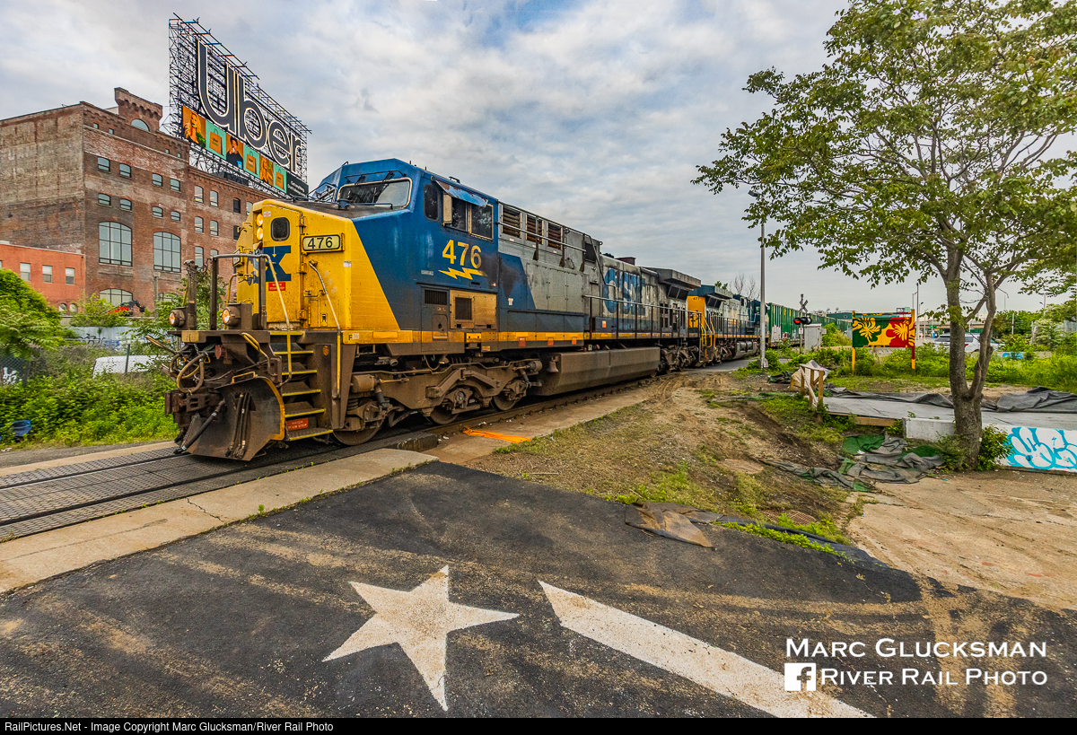 The History Channel Sign Is History. For Clear Channel Outdoor's next 5 year lease period atop 20 Bruckner Boulevard, the Uber Era has begun. This building was once owned by Jacob Ruppert (who also owned the New York Yankees), and the sign has now carried a small handful of names in that time, including Ruppert Beer (1936 to 1952), Knickerbocker Beer, City Services Gasoline, Newport Cigarettes, TheHistory Channel, and iHeartRadio Media. On Tuesday, May 24, 2022, CSX Q704-24 was in the process of making up its train when CSXT 476 (AC44CW, GE, 9/2000) passed under this iconic sign at the crossing near Lincoln Avenue in the Port Morris neighborhood of the Bronx, New York.