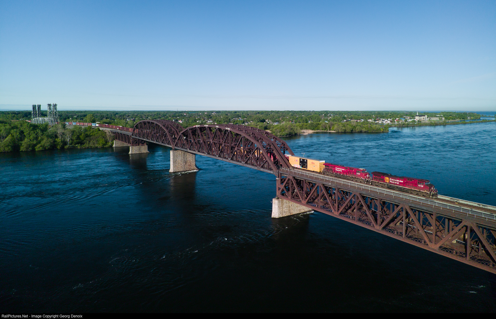 CP 229 is crossing over the St-Lawrence River at Lasalle with CP 8108 and CP 9350 leading on the left (west) track to leave the east track for EXO's commuter trains on the Candiac line.