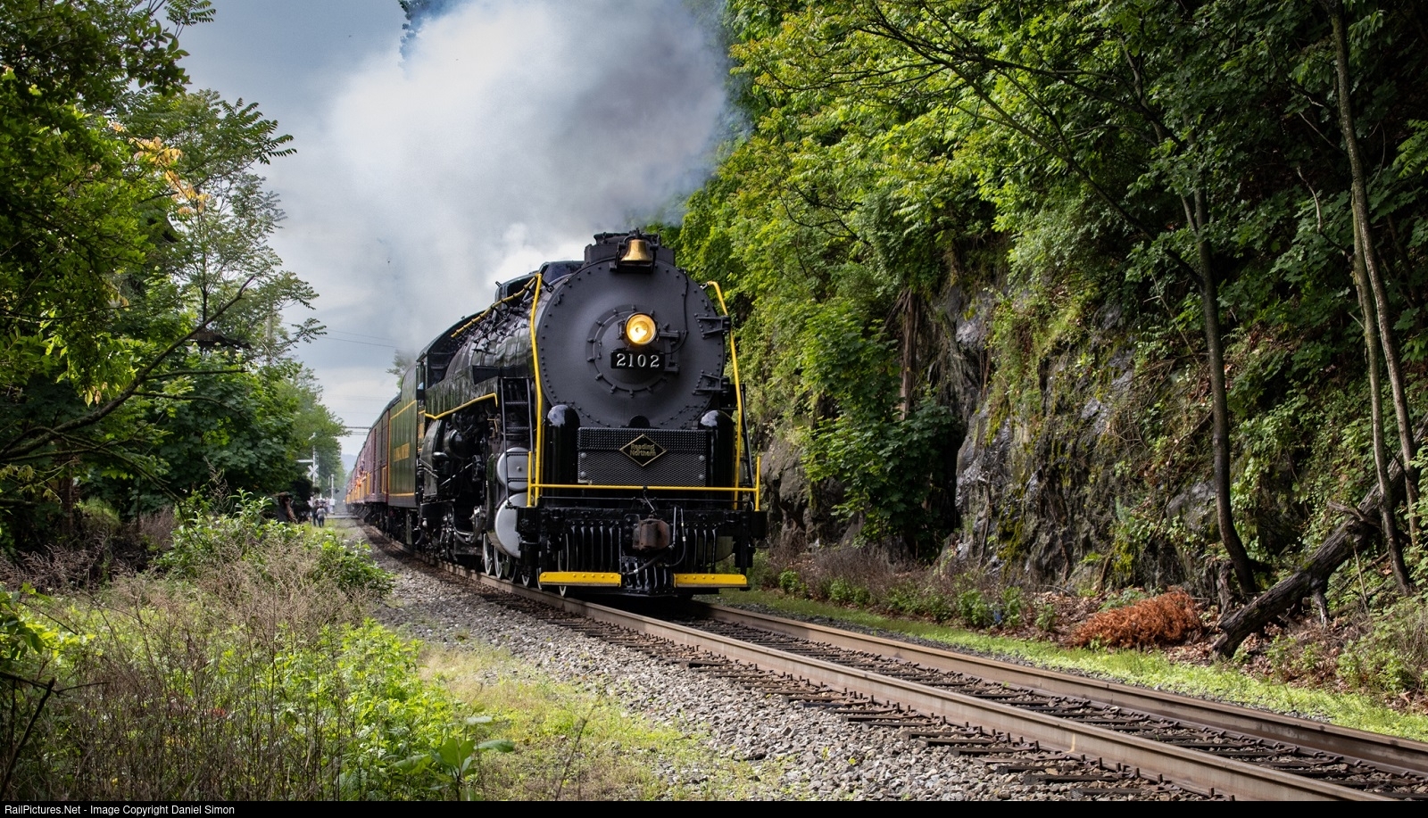Shortly after departing Reading Outer Station, Reading 2102 pulls its first passenger excursion train on the Reading and Northern Railroad past a rock wall in Leesport, Pennsylvania.