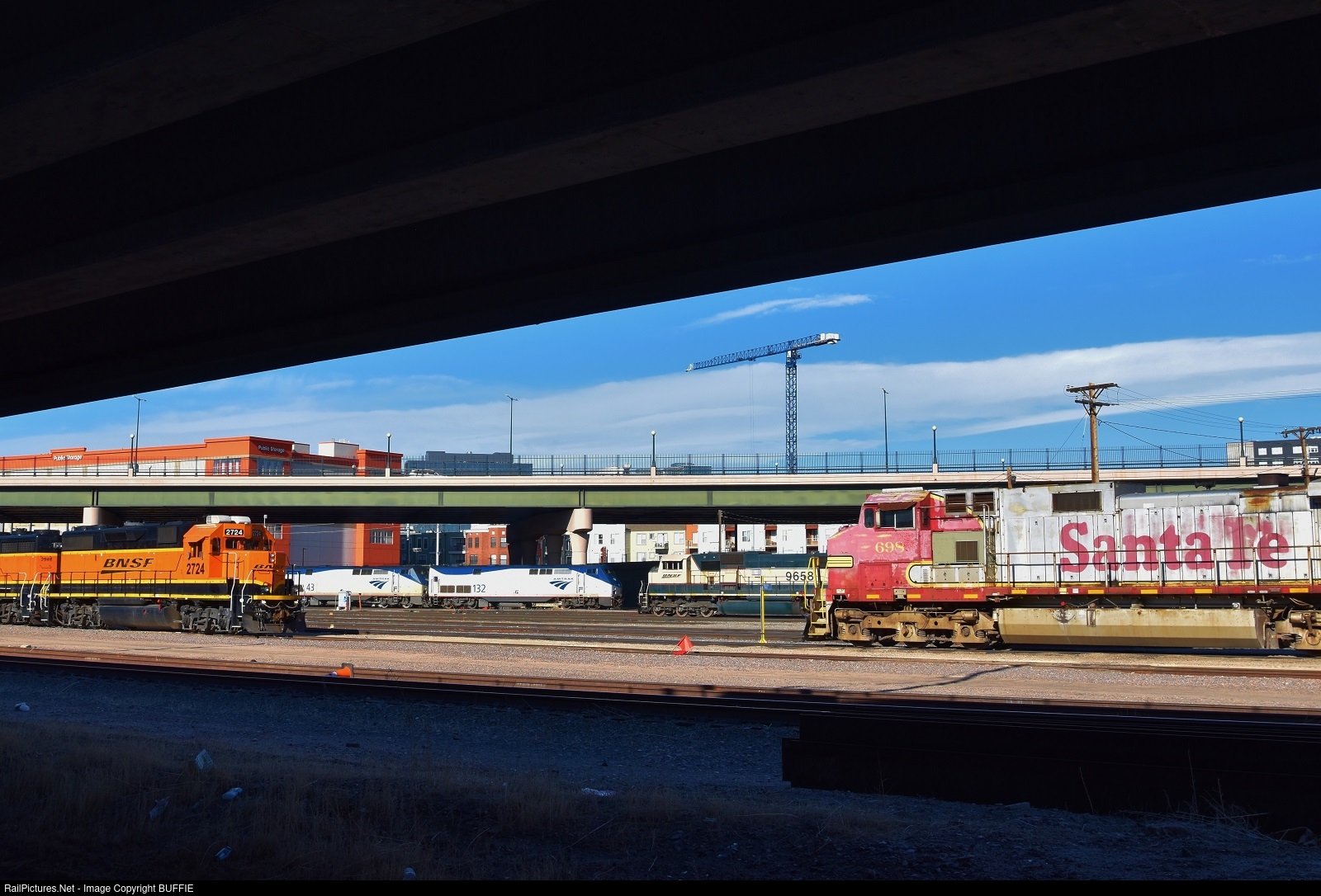 | The California Zephyr leaves Denver's Union Station and runs under the Park Avenue Viaduct which is adjacent to the BNSF engine servicing facility.