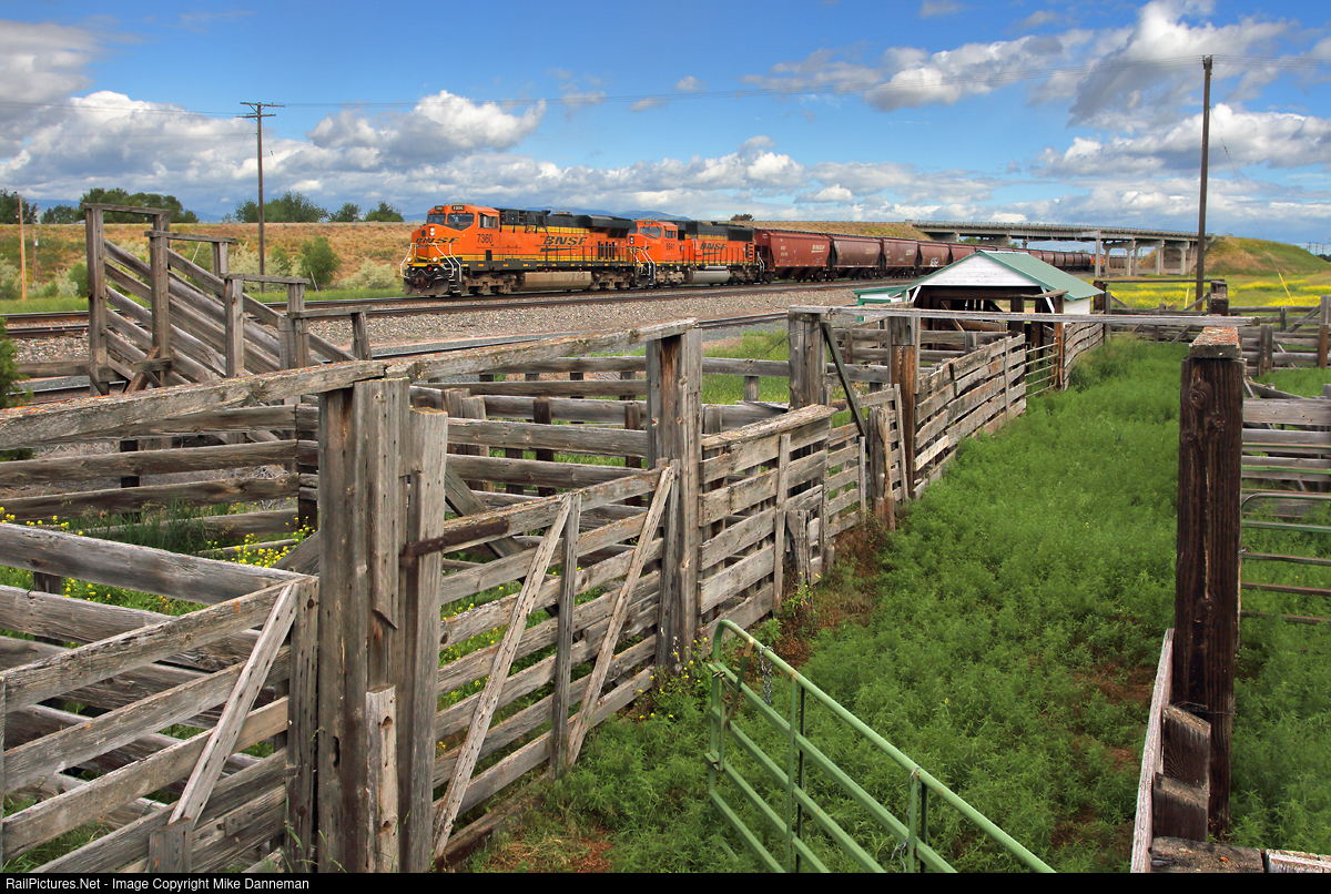 An eastbound BNSF grain empty passes the old Northern Pacific-era stock pens and loading chutes still located along Montana Rail Link’s Second Subdivision at Toston, Montana, on the morning of July 1, 2018.