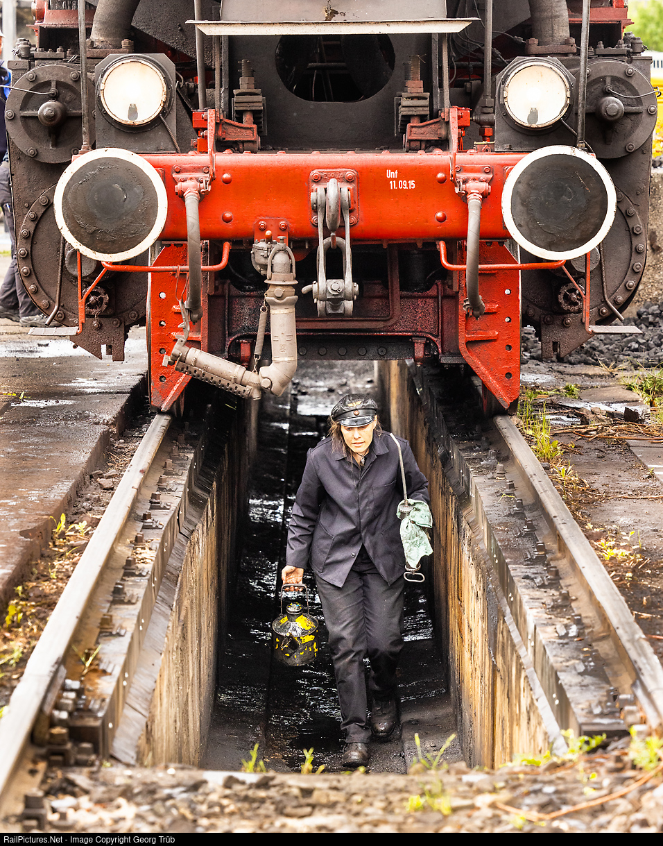 The 2-10-0 freight steam locomotive 52 # 8168 of the Bavarian Railway Museum in Nördlingen (BEM) has a fairly young crew, including a woman as stoker. She has just stepped out of the dark pit after greasing the axle bearings under the locomotive.