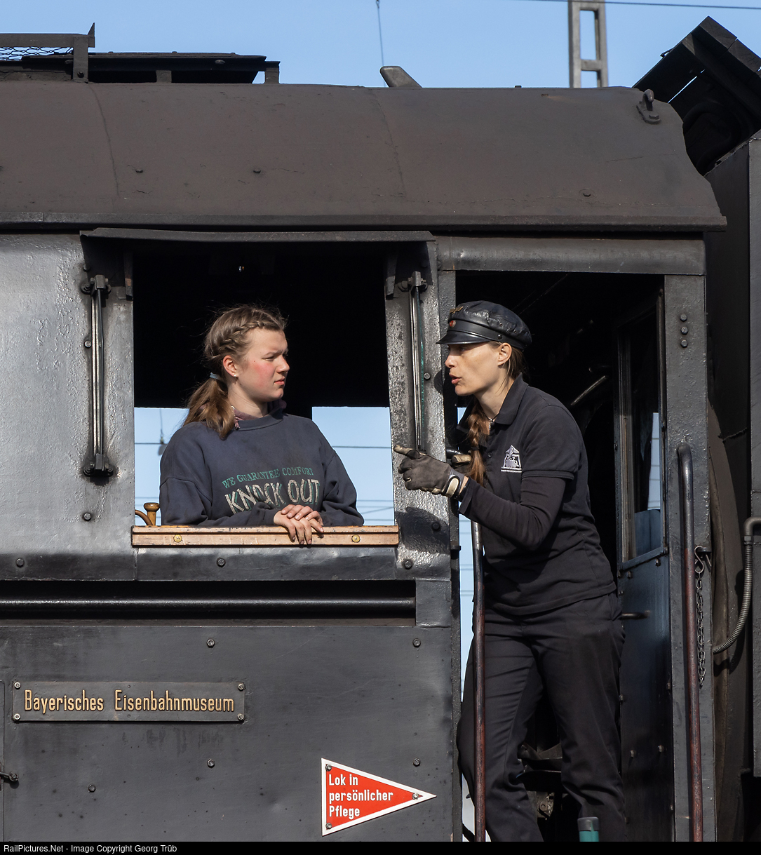 Young female locomotive crew on the 2-10-0 freight train steamlocomotive 52 # 8168 of the Bavarian Railway Museum (BEM) in Nördlingen. The red shield with the words: "Lok in persönlicher Pflege" /"locomotive in personal care" was placed on some steamlocomotives in the German Democratic Republic (GDR). The Soviet locomotive driver Nikolai Alexandrovich Lunin, born in 1915, had the idea of extending the service life between two main inspections between 100,000 and 200,000 kilometers by personal care of the locomotive by the personnel.