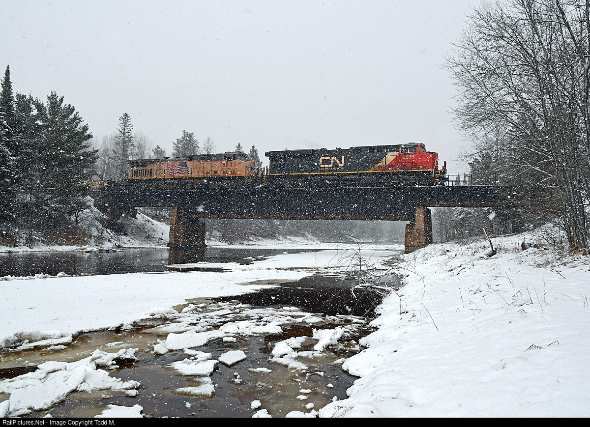 Pulling freight through the snow crossing over the St. Louis River on the CN Rainy sub.