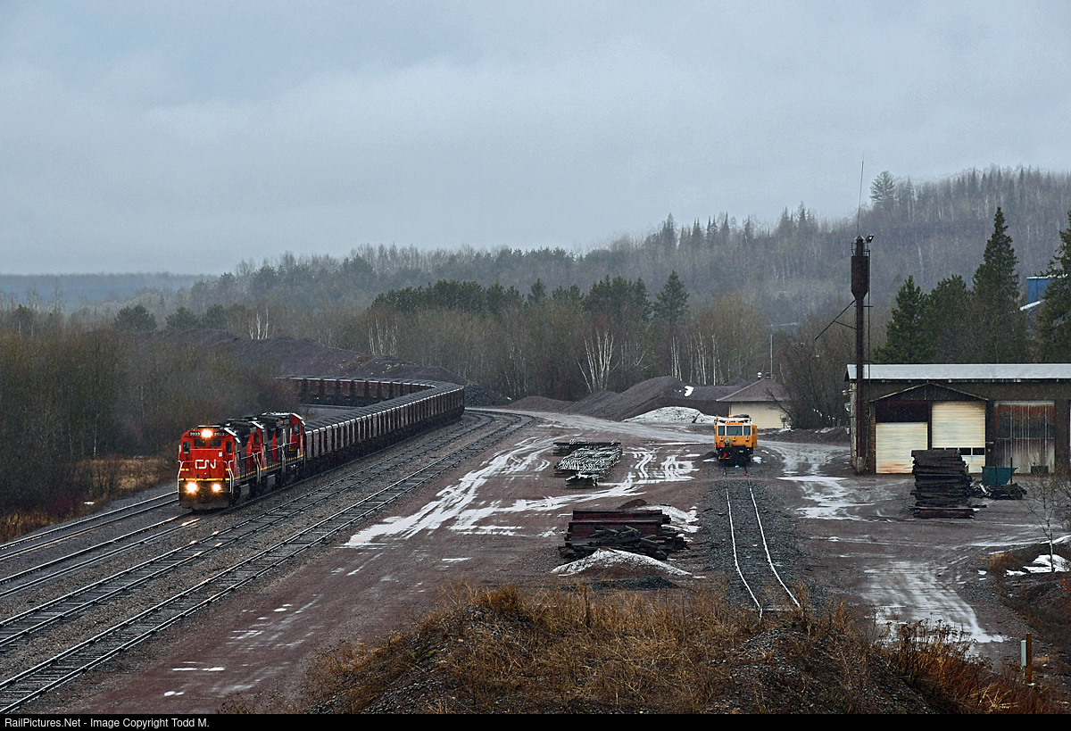 | On a typical spring day with dark skies, cold winds and mixed precipitation, CN 2033 slows while coming into the curve at Biwabik on the running track to wait for a northbound that will keep on moving at track speed on the main. |