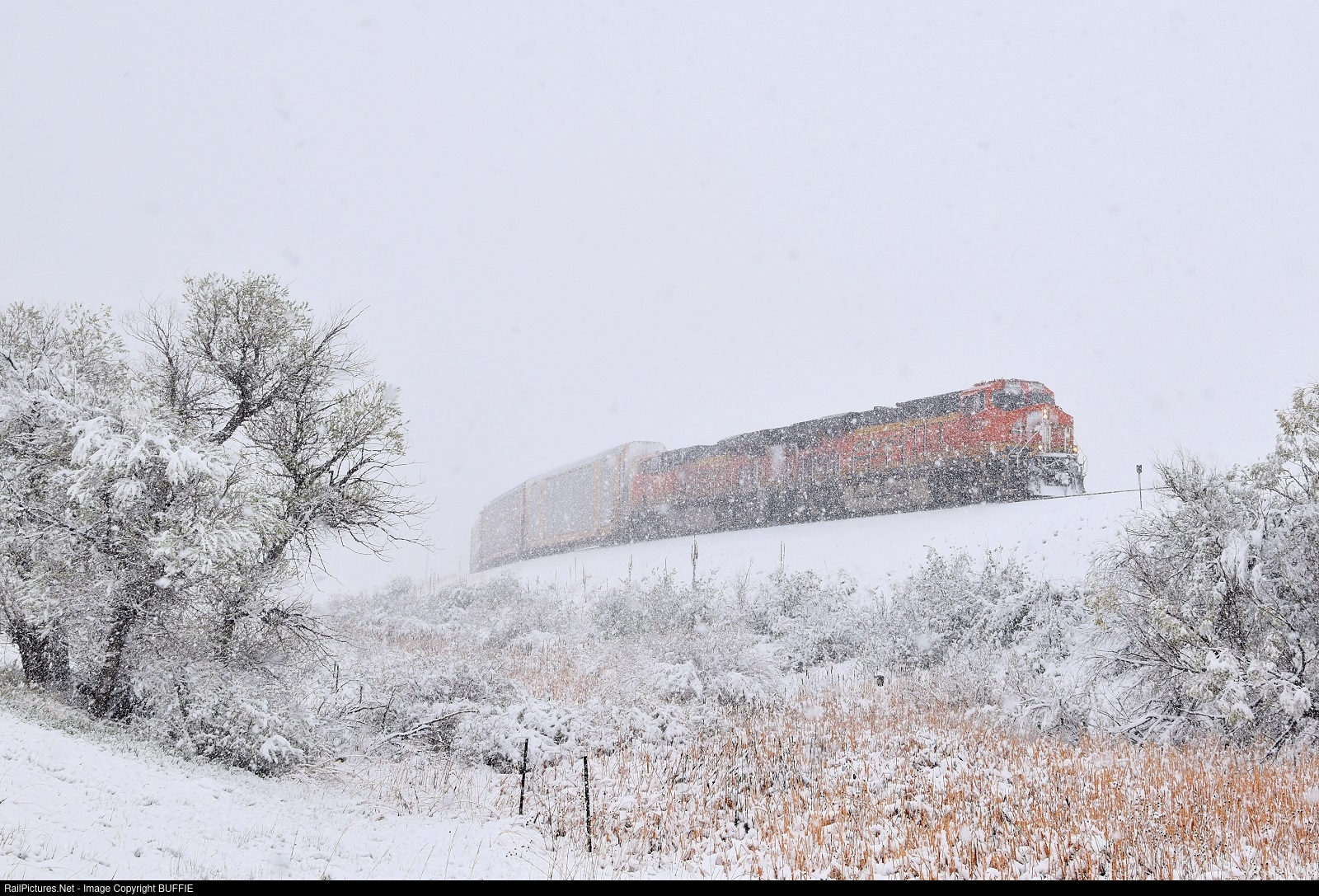 The snow is falling fast as BNSF 4252 (ES44C4) takes a train through Spruce, Colorado.