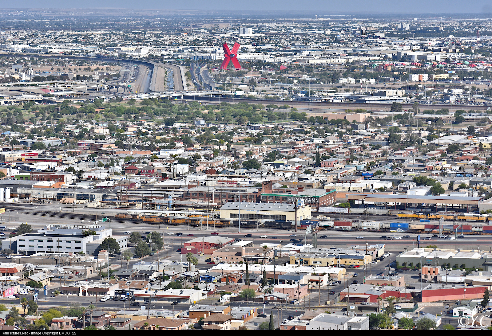 | A UP intermodal train heads east through El Paso with a pair of NS engines (including a rebuilt SD70ACC). Visible in the back is the US - Mexico border and Ciudad Juarez in the Mexican state of Chihuahua. |